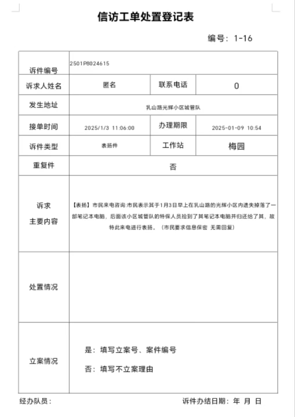 1月10日15:05,浙江民泰公司駐杭州市余杭區(qū)五常街道市容項(xiàng)目員工田佳在五常街道同順街巡查時(shí),撿到一部華為手機(jī)。詢問路人無果后,便將情況報(bào)告了班組長(zhǎng),并按指示在原地等待。