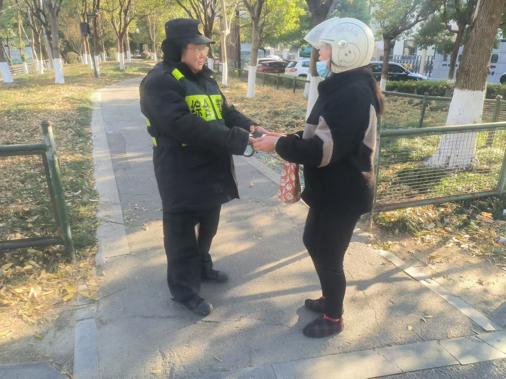 大約過了30分鐘,一位身穿紅色外套的阿姨匆匆趕來,焦急地詢問侯晨有沒有在這附近看到一部手機(jī)。侯晨和趙華偉聽完阿姨的描述,核對(duì)確認(rèn)阿姨是失主后,就將手機(jī)交還給了她。阿姨拿到手機(jī),連連向侯晨和趙華偉道謝。 (供稿人:王亞濤)