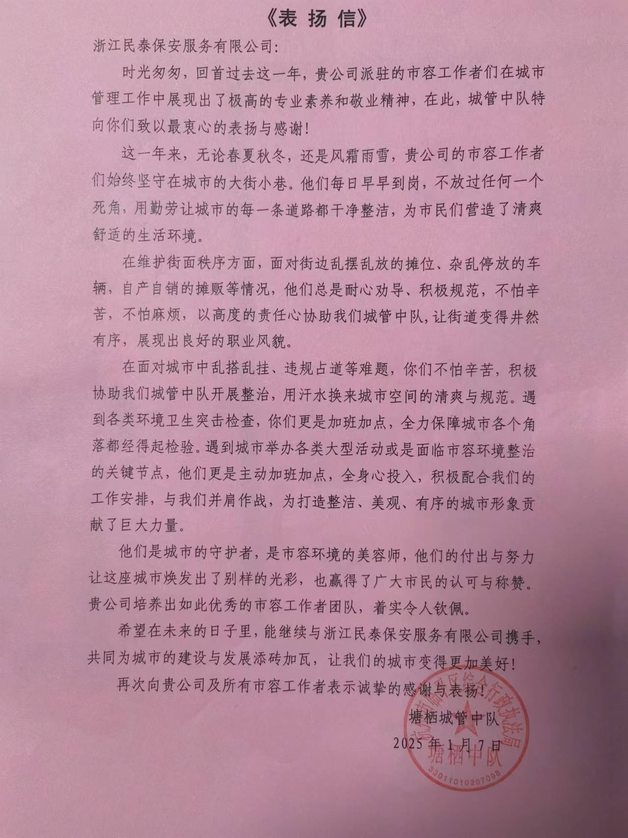 1月7日,浙江民泰公司駐杭州市臨平區(qū)塘棲城管中隊輔助項目收到塘棲城管中隊的表揚信,感謝公司對塘棲城管中隊工作的大力支持和積極配合,表揚公司項目員工勤懇扎實、盡心盡責(zé),為建設(shè)美麗塘棲付出的辛勤努力。