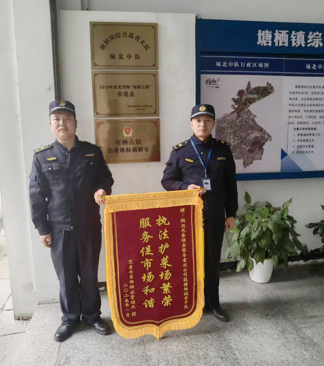 1月13日,浙江民泰公司駐杭州市臨平區(qū)塘棲城管中隊輔助項目收到范家斗菜場物業(yè)管理處贈送的繡有“執(zhí)法護菜場繁榮 服務(wù)保市場和諧”的錦旗,贊揚公司全力協(xié)助物業(yè)管理處維護市場良好秩序的出色表現(xiàn)。