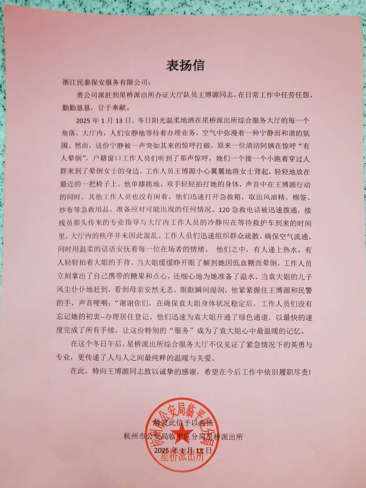 1月17日,浙江民泰公司收到杭州市公安局臨平區(qū)分局星橋派出所的表揚信,信中對公司員工王博源熱心救助暈倒阿姨的暖心舉動給予了高度贊揚。