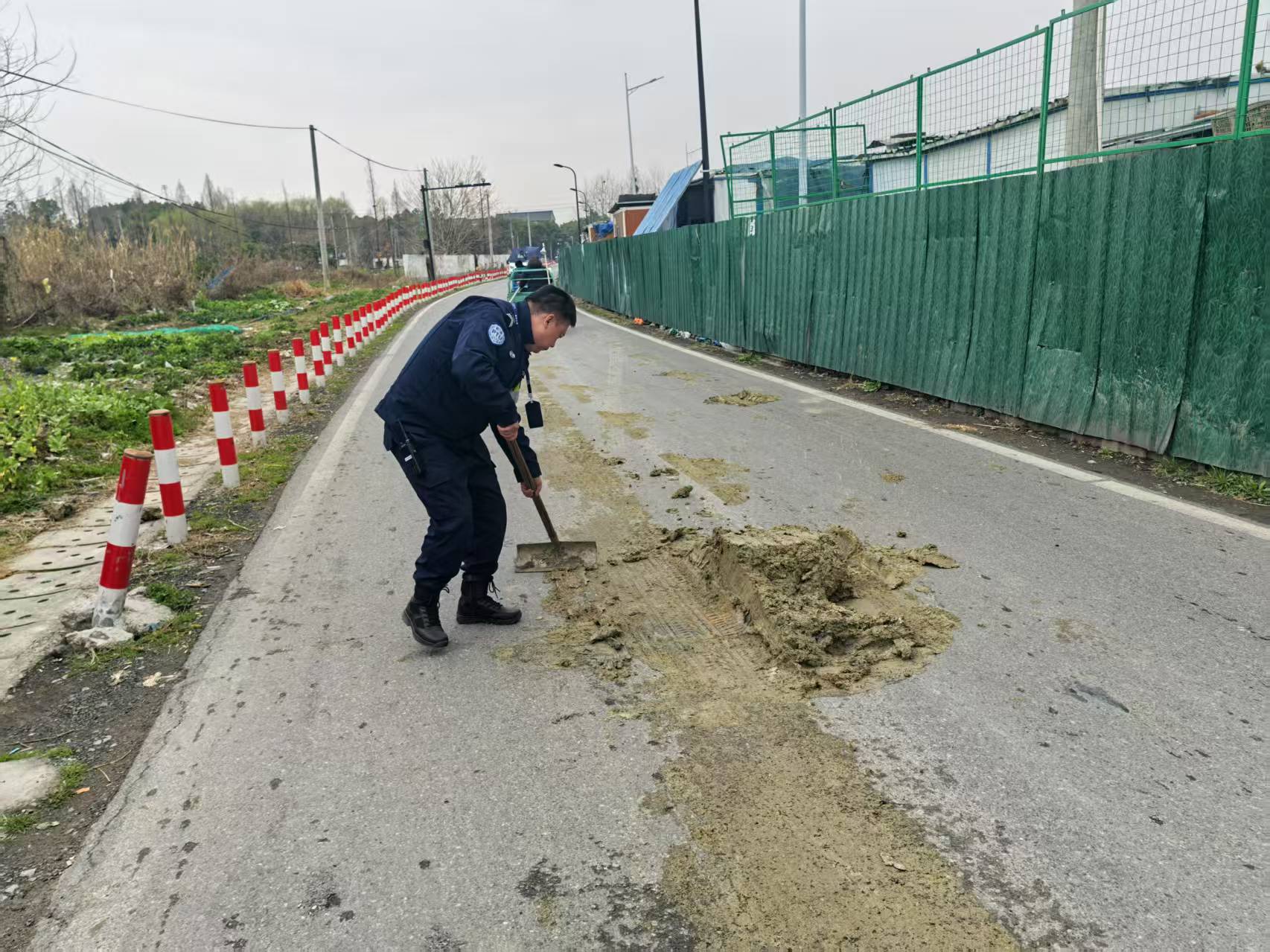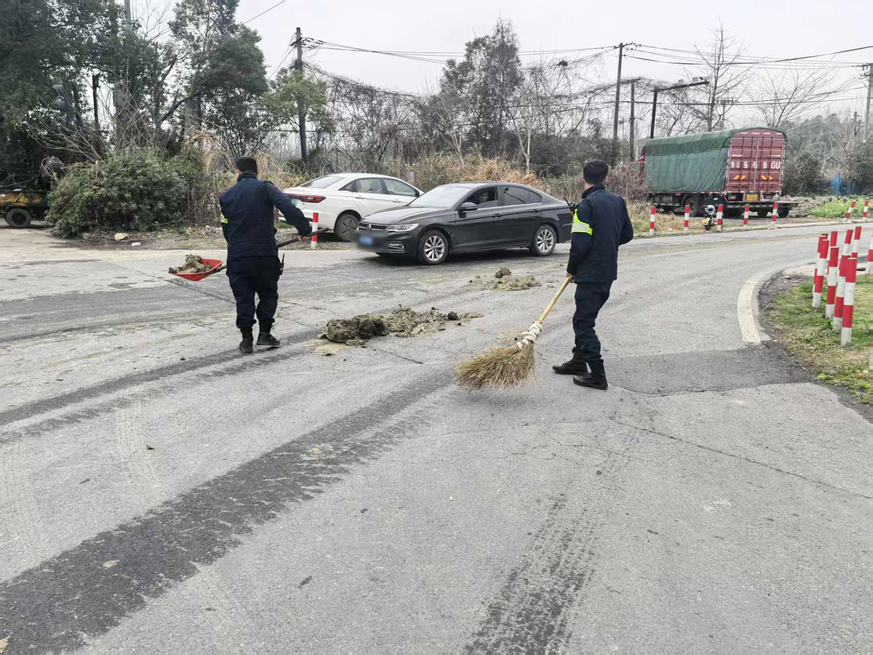 3月5日,浙江民泰公司駐杭州市余杭區(qū)良渚新城派出所輔助項(xiàng)目員工齊心協(xié)力清理路面散落黏土,保障道路通行安全。