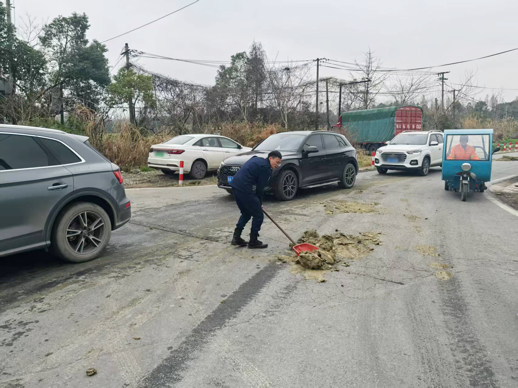 面對(duì)這一緊急情況,巡車長(zhǎng)張正富迅速做出反應(yīng),站在路口指揮交通,確保車輛能夠有序通行,有效防止事故的發(fā)生。與此同時(shí),公司員工賈雙諭和隊(duì)員周軍也在第一時(shí)間行動(dòng)起來(lái),他們?cè)谥車O(shè)置了警示區(qū)域并放置警示標(biāo)識(shí)以提醒路人注意安全,隨后從附近停車場(chǎng)借來(lái)了鐵鍬、鐵耙等必要的清理工具,投入到緊張的清理工作中去。