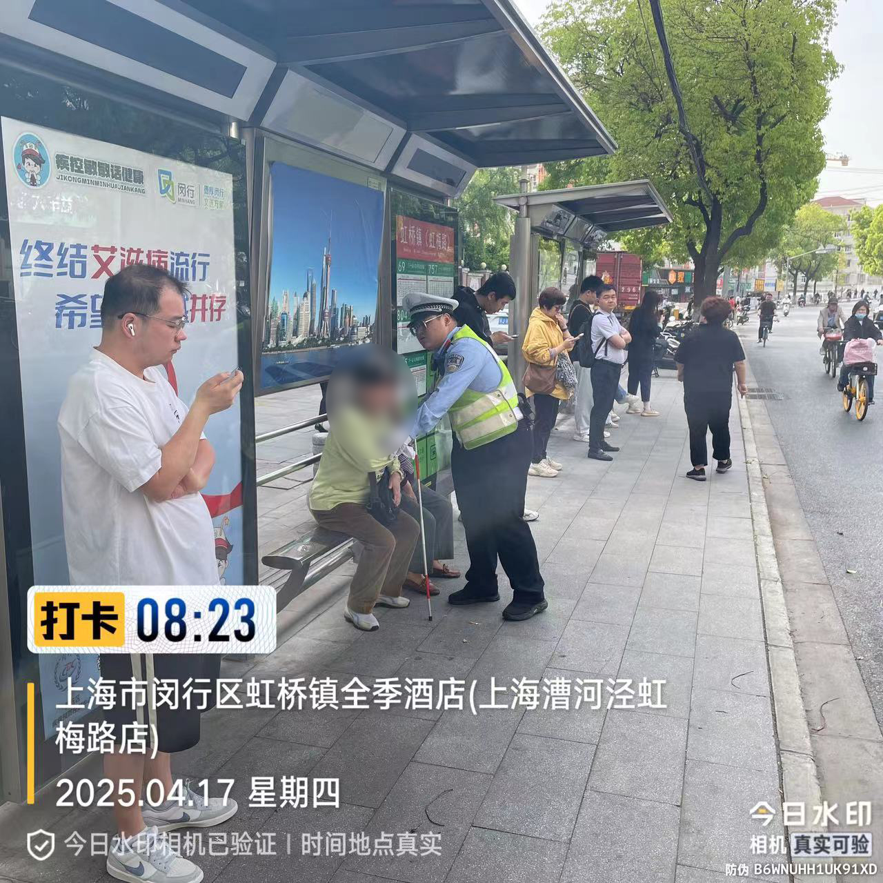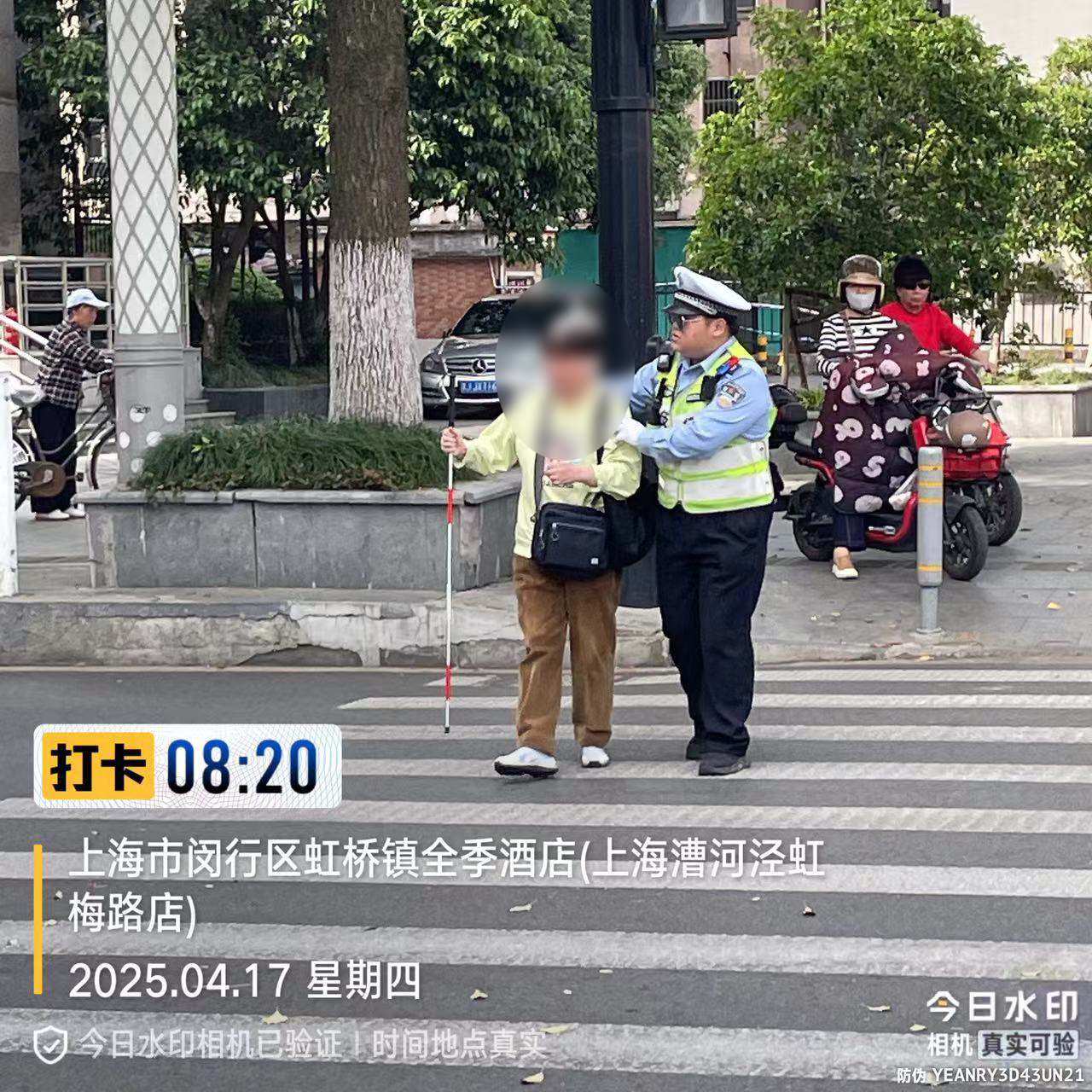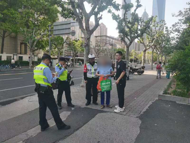 當(dāng)日8時(shí)20分,郭明皓在吳中路虹梅路路口執(zhí)勤時(shí),發(fā)現(xiàn)一位盲人老人在馬路中央艱難穿行,周圍車流密集,情況十分危險(xiǎn)。他立即上前指揮車輛暫停,并迅速將老人攙扶至安全區(qū)域。經(jīng)詢問得知,老人需要乘坐69路公交車前往目的地??紤]到公交站臺(tái)距離較遠(yuǎn)且路況復(fù)雜,為確保老人安全,郭明皓主動(dòng)護(hù)送老人前往站臺(tái)。