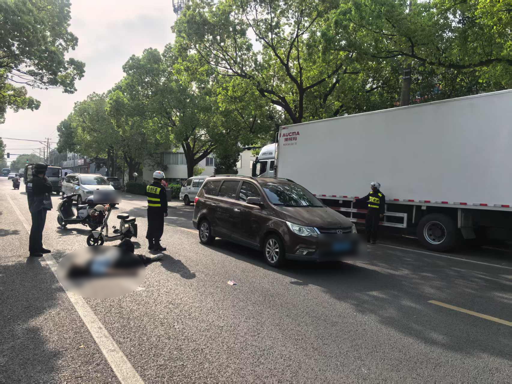 當(dāng)日7時(shí)53分,黃建成和朱智龍?jiān)谥茏9方ㄔO(shè)路巡查時(shí),發(fā)現(xiàn)一名女子騎電瓶車不慎摔倒。由于未佩戴頭盔,女子頭部著地后當(dāng)場失去意識(shí),情況十分危急。面對(duì)突發(fā)狀況,兩人迅速反應(yīng),第一時(shí)間撥打了120急救電話并報(bào)警求助。