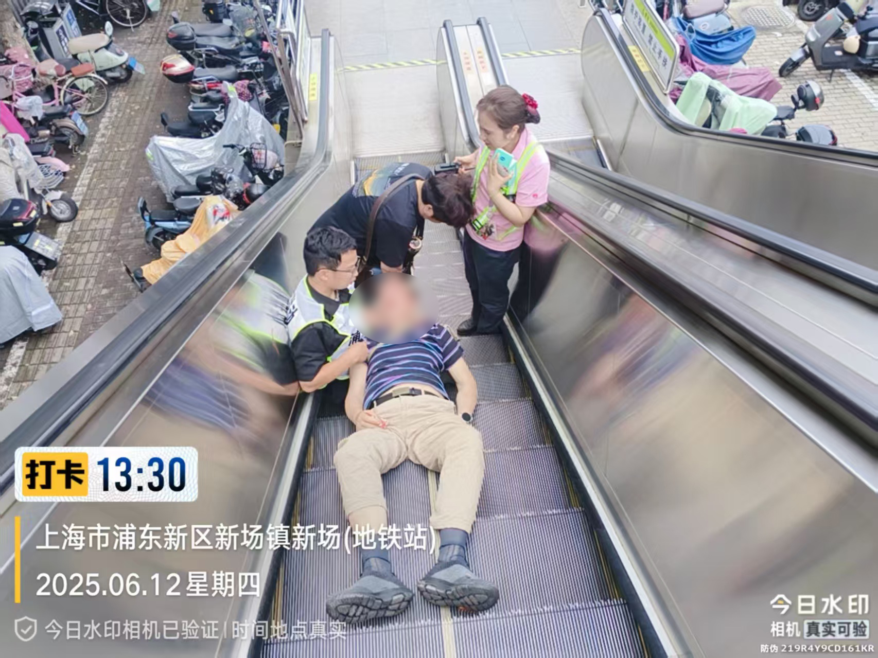 當日13:25,正在16號線新場地鐵站2號口附近巡邏的公司員工翟佳明,突然聽到一陣急促的喊叫聲,來不及多想的他便立即循聲跑去。