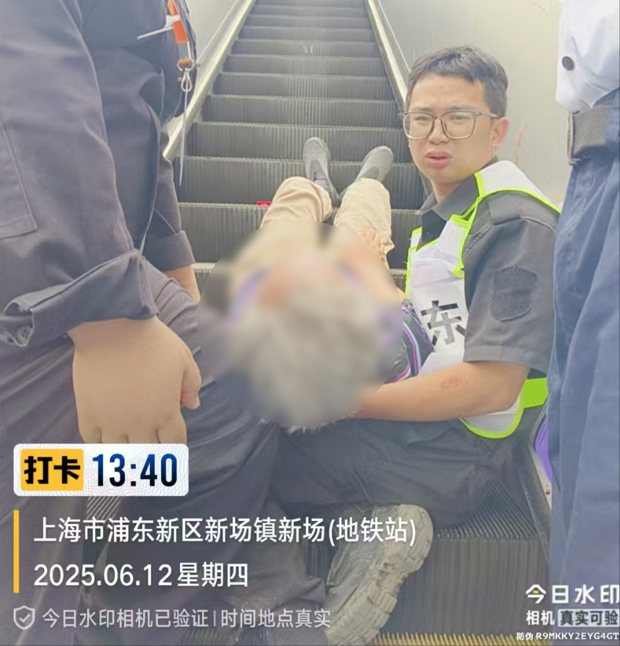 翟佳明趕到現(xiàn)場,看到令人揪心的一幕:一位老人摔倒在正在上行的手扶電梯上,頭部鮮血直流。情況危急,翟佳明先是迅速按下電梯緊急停止按鈕,避免老人遭受二次傷害。