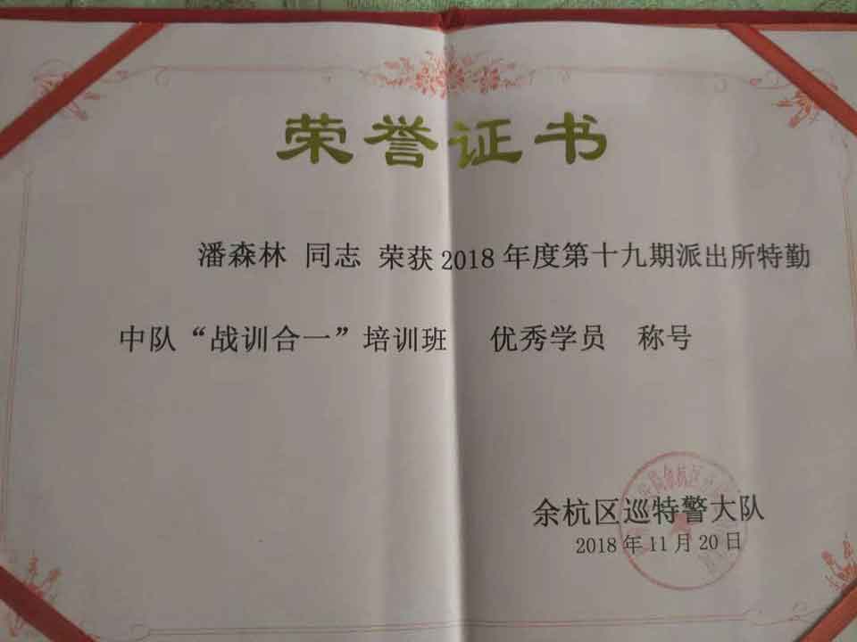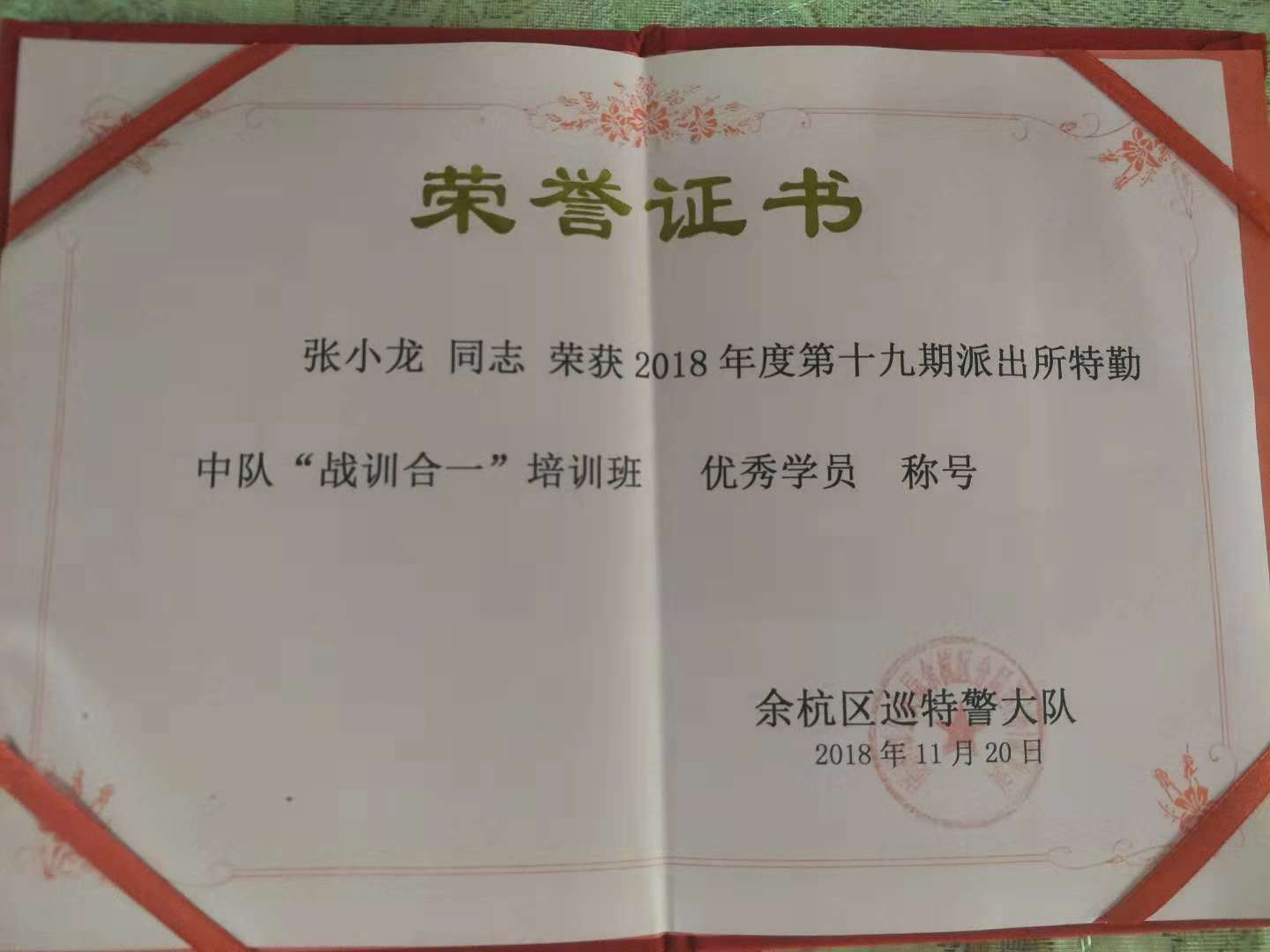 功夫不負有心人,經(jīng)過嚴格的理論考試和實戰(zhàn)考核,張小龍和潘森林二位學員表現(xiàn)尤為突出,榮獲了余杭區(qū)巡特警大隊頒發(fā)的榮譽證書 —— 2018年度第十九期派出所特勤中隊“戰(zhàn)訓合一”培訓班優(yōu)秀學員稱號。