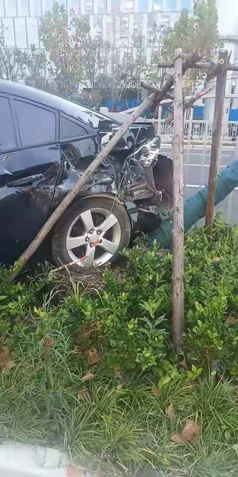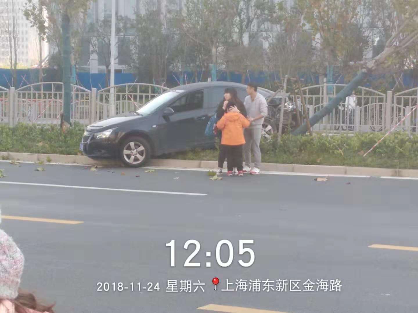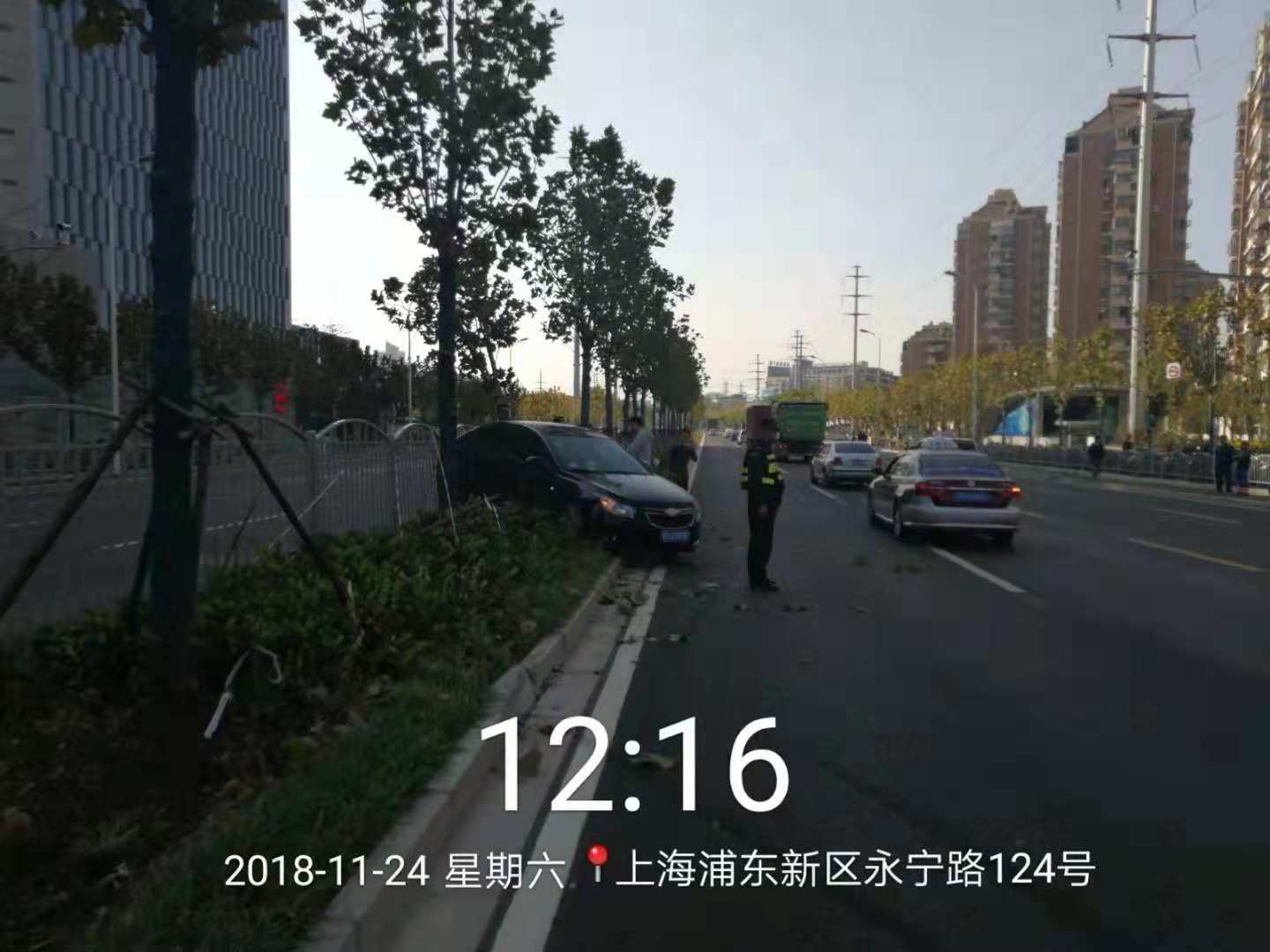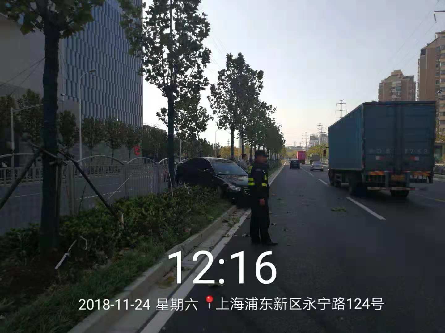 12:00左右,當(dāng)宗保駐金橋輔警項目巡邏隊員,巡邏經(jīng)過金橋地鐵站附近時,發(fā)現(xiàn)路上發(fā)生了一起車禍,因一輛大卡車強行變道,撞上小轎車車尾,導(dǎo)致小轎車撞向綠化帶,所幸事故中無人傷亡。隊員許偉立即向帶班組長匯報情況,并和隊友及金橋城管巡邏隊員一起參與到交通事故救助中,一起保護現(xiàn)場,維持交通秩序,等待交警來處理。
