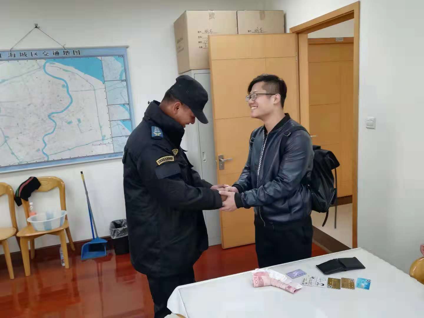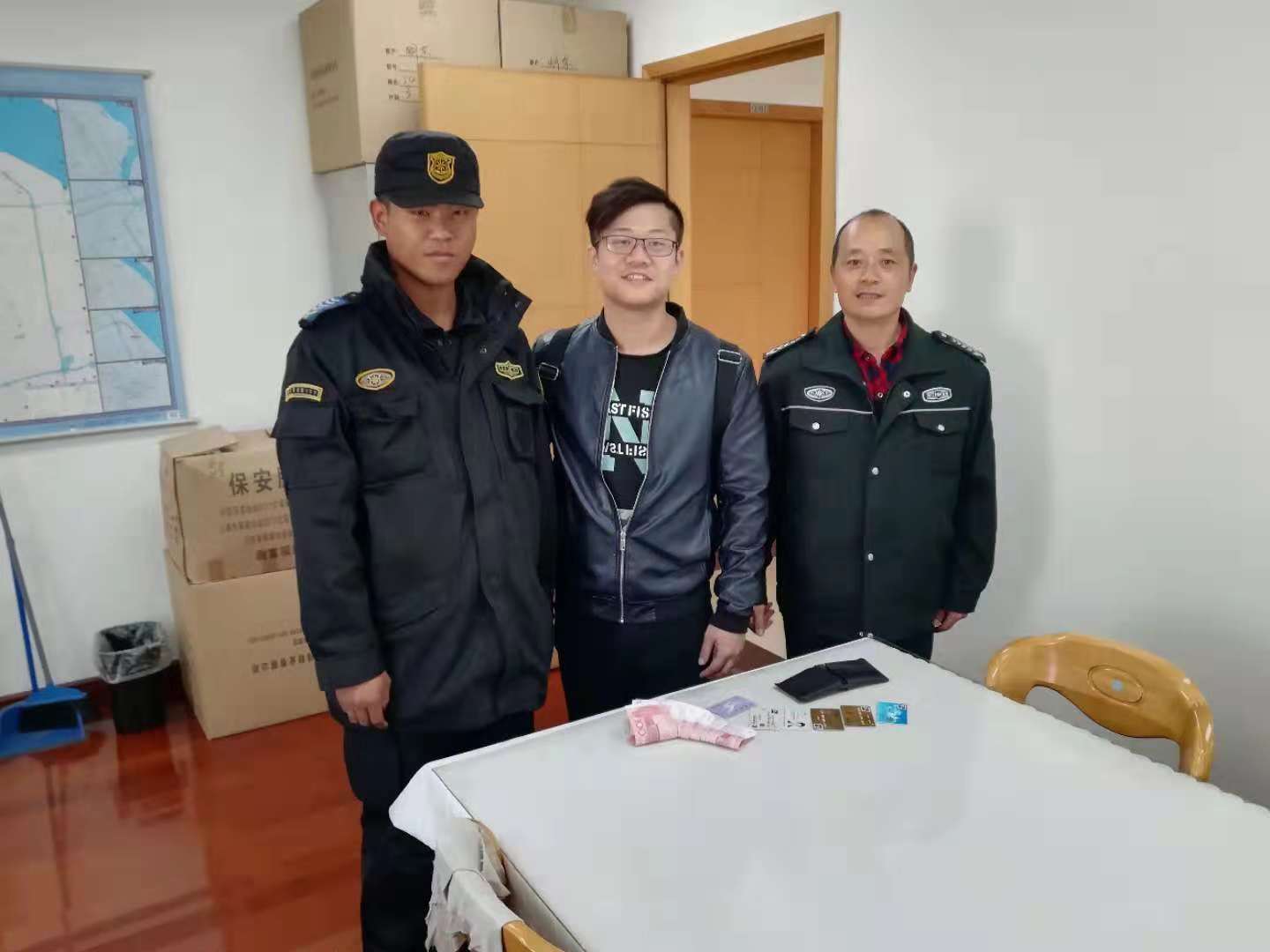 當(dāng)日上午10:20左右,宗保駐高行市容項(xiàng)目隊(duì)員王萌昊,在回崗?fù)?zhí)勤的路上,看到一個(gè)黑色皮夾。王萌昊當(dāng)時(shí)四周查看是否有人回來(lái)領(lǐng)取,在原地等待了幾分鐘無(wú)人來(lái)領(lǐng)取,就拿著錢(qián)包回崗?fù)?zhí)勤。