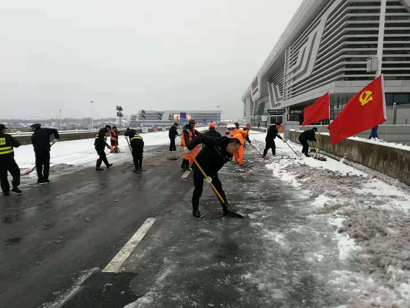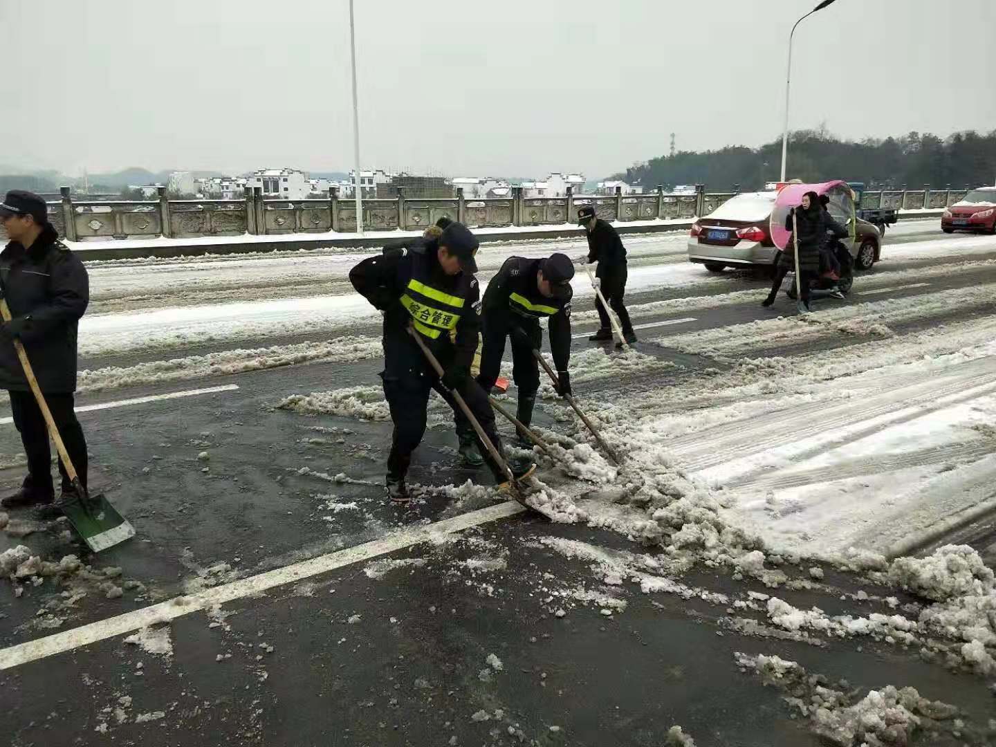 2018年11月8日晚,黃山突降大雪,嚴(yán)寒天氣,道路覆冰,交通受阻,給人們的生活和工作帶來(lái)了嚴(yán)重影響。為了積極應(yīng)對(duì)冰雪天氣出行平安,11月9日晨曦初露,宗保駐黃山各區(qū)縣市容項(xiàng)目隊(duì)員紛紛帶好鐵鍬、掃帚等工具,積極配合政府加入到鏟冰除雪的行動(dòng)中。經(jīng)過(guò)大家一個(gè)上午的奮戰(zhàn),道路上的冰雪被鏟至路邊,為交通出行掃除了障礙。