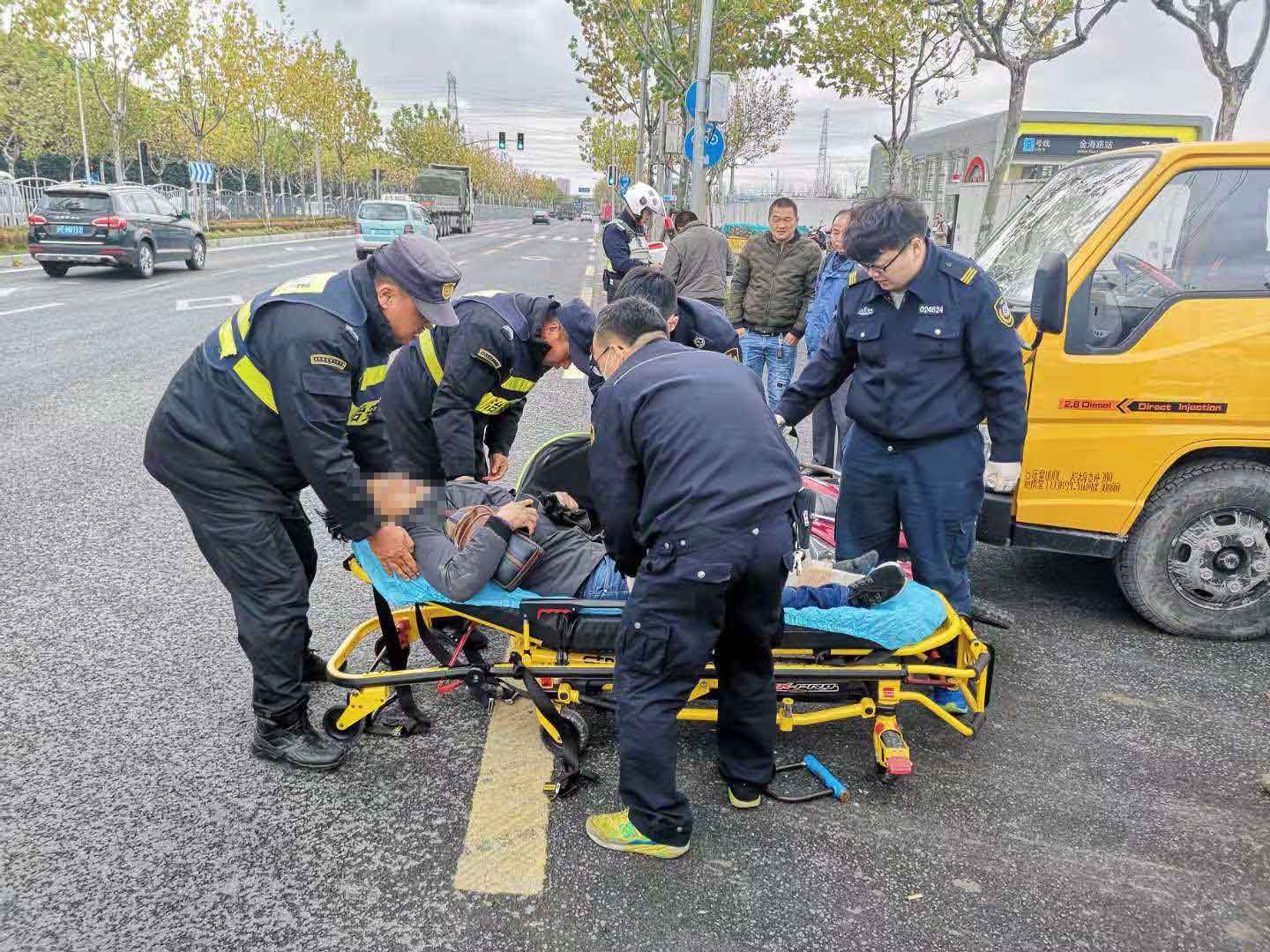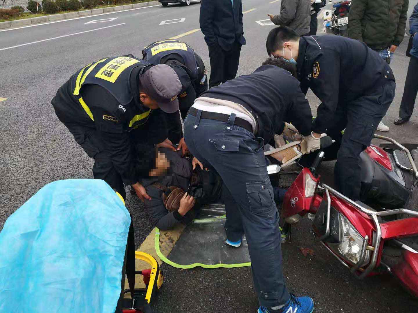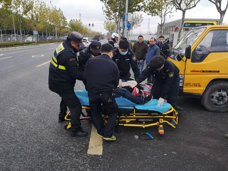 當日10:30,當宗保隊員陳友明和黎小江巡邏至地鐵金海路站,突然聽到一身巨響,回頭一看,是在老陳王廟路口,一輛貨車與電瓶車相撞,發(fā)生了交通事故。兩名隊員立即奔過去,控制并保護現(xiàn)場,對現(xiàn)場情況進行勘查,并把事故立即上報給當日值班領(lǐng)導。隊員了解情況后,讓貨車司機拔打110報警,隊員陳友明馬上打了急救電話120。路口來往車輛較多,兩名隊員立馬指揮來往車輛,以防造成擁堵導致救護車無法正常駛?cè)?。電瓶車主受傷嚴重,救護車一到,隊員馬上協(xié)助救護人員一起把傷者抬上救護車,讓醫(yī)護人員將傷者送往醫(yī)院救治。
