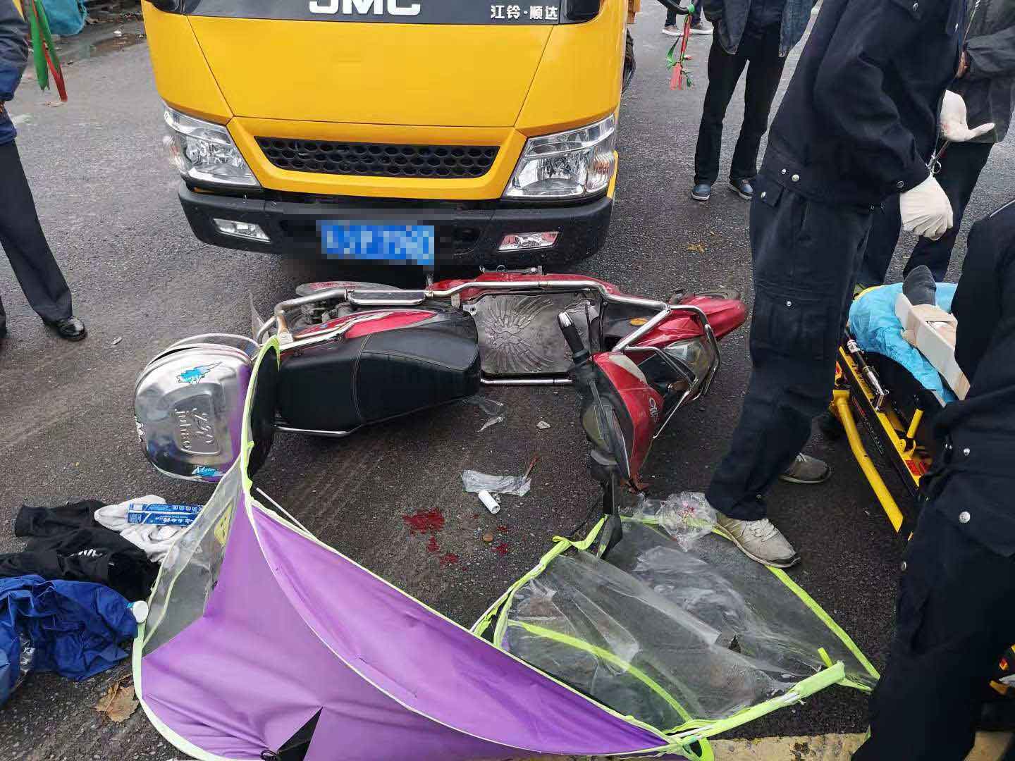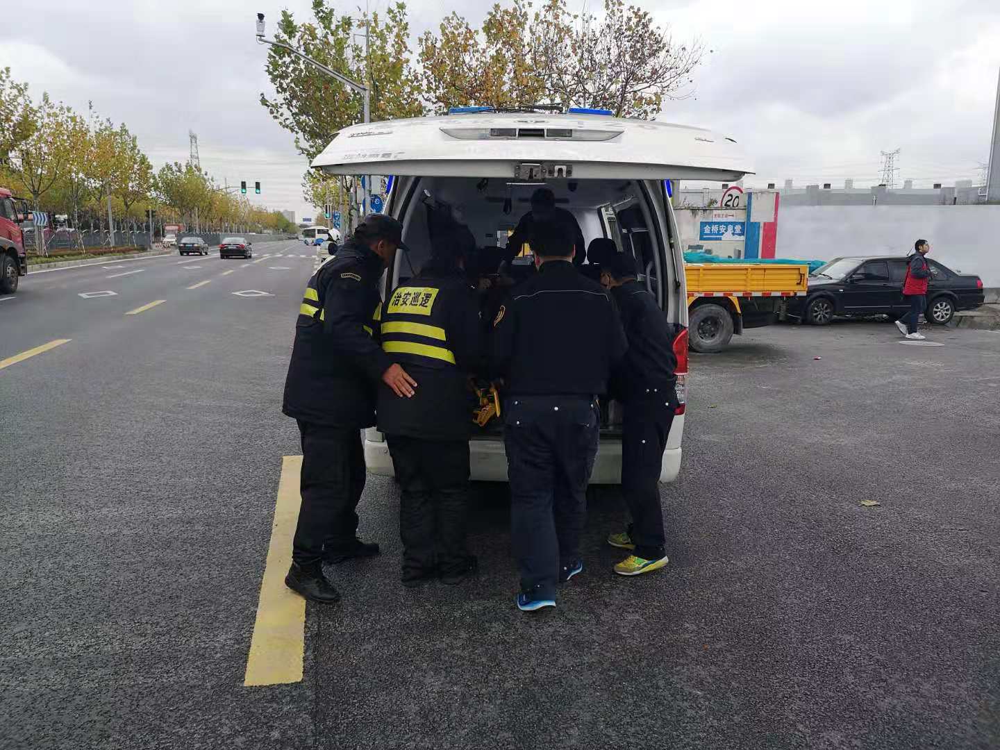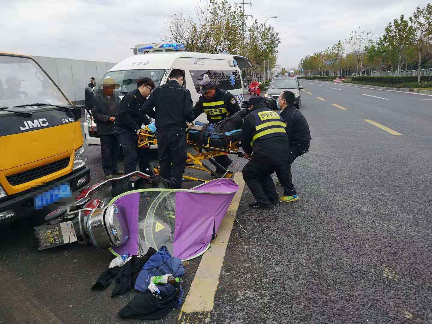 當日10:30,當宗保隊員陳友明和黎小江巡邏至地鐵金海路站,突然聽到一身巨響,回頭一看,是在老陳王廟路口,一輛貨車與電瓶車相撞,發(fā)生了交通事故。兩名隊員立即奔過去,控制并保護現(xiàn)場,對現(xiàn)場情況進行勘查,并把事故立即上報給當日值班領(lǐng)導。隊員了解情況后,讓貨車司機拔打110報警,隊員陳友明馬上打了急救電話120。路口來往車輛較多,兩名隊員立馬指揮來往車輛,以防造成擁堵導致救護車無法正常駛?cè)?。電瓶車主受傷嚴重,救護車一到,隊員馬上協(xié)助救護人員一起把傷者抬上救護車,讓醫(yī)護人員將傷者送往醫(yī)院救治。