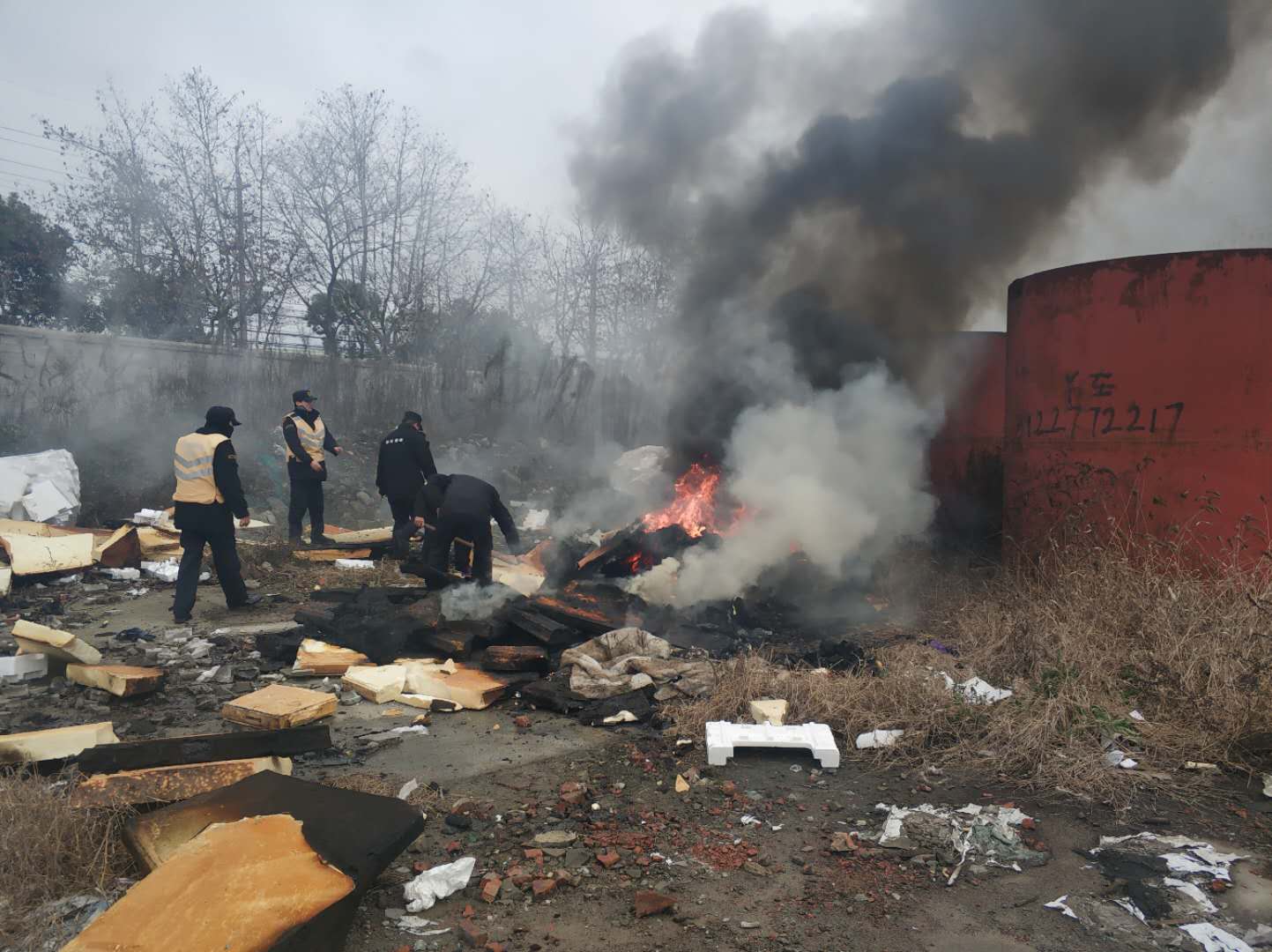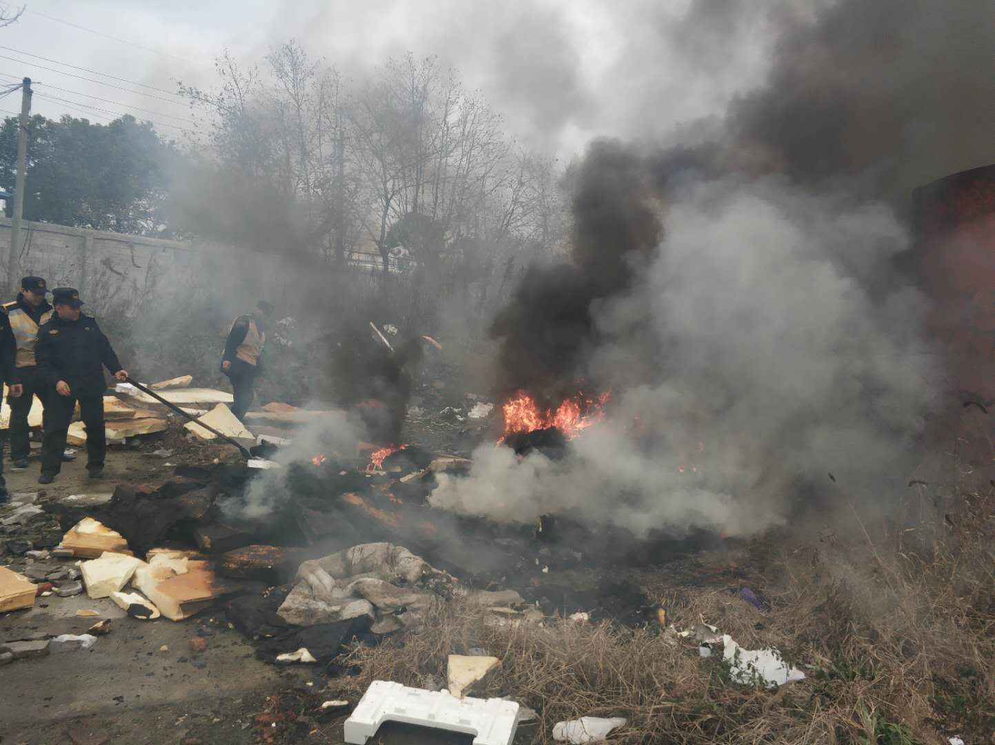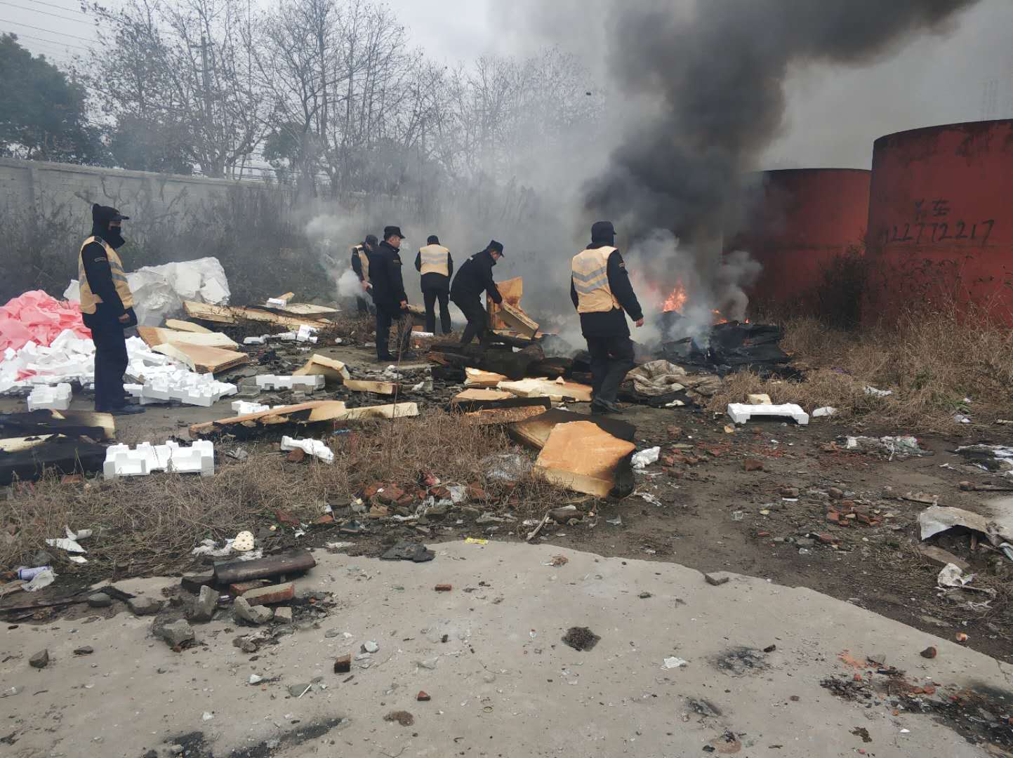 2018年12月31日14:16,宗保隊(duì)員駐金橋市容隊(duì)員胡成林、張?chǎng)卧谘膊橹撂坡仿吩S加溝橋西側(cè),發(fā)現(xiàn)圍墻內(nèi)有濃煙。細(xì)心查看,發(fā)現(xiàn)圍墻內(nèi)堆放的廢舊泡沫在燃燒。若不及時(shí)處理,火情將持續(xù)蔓延,危及周邊群眾安全,造成空氣污染。面對(duì)這種情況,隊(duì)員立即上報(bào)區(qū)域負(fù)責(zé)人,同時(shí)撥打了119火警電話。負(fù)責(zé)人第一時(shí)間趕至現(xiàn)場(chǎng),指揮隊(duì)員搬移泡沫,控制火情蔓延,并安排隊(duì)員進(jìn)行安全警戒,疏導(dǎo)勸離圍觀群眾。消防人員于14:27到達(dá)現(xiàn)場(chǎng)進(jìn)行滅火,14:43火情徹底被熄滅,未造成人員和財(cái)產(chǎn)損失。