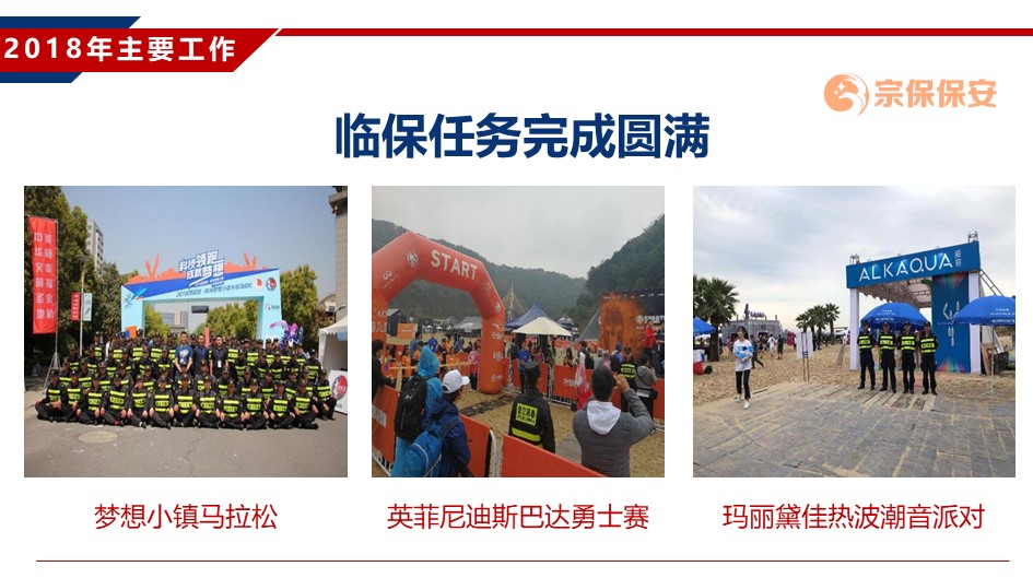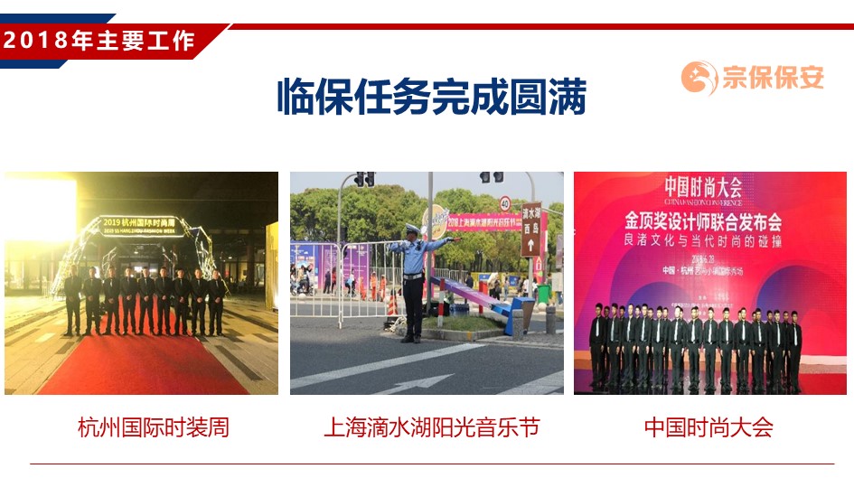 為百姓排憂解難,為政府保駕護航。夢想小鎮(zhèn)半程馬拉松賽,2000多名隊員從上海奔赴杭州保障,人數(shù)多、距離遠、戰(zhàn)線長,既是管理能力的考驗,也是公司實力的展示;“五一”、“十一”臨港系列活動,人防、技防相互支撐、互相補位,成效顯著;英菲尼迪斯巴達勇士賽、中國時尚大會、中國青年數(shù)字經(jīng)濟創(chuàng)業(yè)大賽、杭州星空長灘音樂狂歡、西湖公共關(guān)系論壇會議等,大型活動安保一項接一項,人氣爆棚,又秩序井然?;顒蝇F(xiàn)場秩序維護、交通疏導、路線警衛(wèi)、停車場管理,處處都有宗保人的身影。有作為才能有地位。腳踏實地的宗保人用自己的實際工作贏得了社會的認可和尊重。
