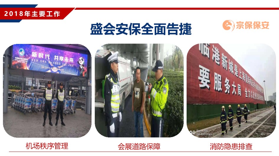 滄海橫流方顯英雄本色。首屆上海進口商品博會,舉世矚目,舉國關(guān)注,影響深遠。盛會安保,政治敏感性強,社會關(guān)注度高,容不得半點差錯。公交安全保障、機場秩序維護、交通秩序保暢、無人機管控、社會治安巡邏、消防隱患排查等,多項任務(wù)面前,宗保人勇于擔當,忠于職守,樂于奉獻,無一事故,無一違紀,用實際行動為國家盛會獻出一份安全厚禮。