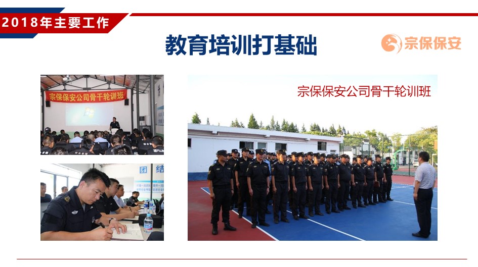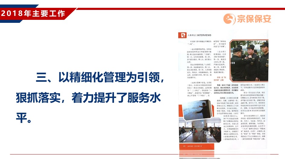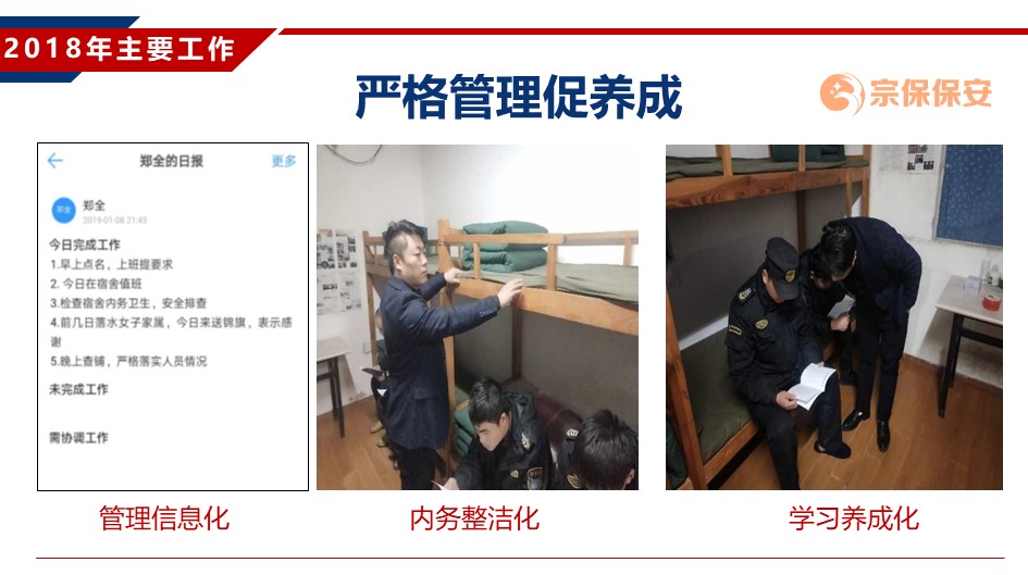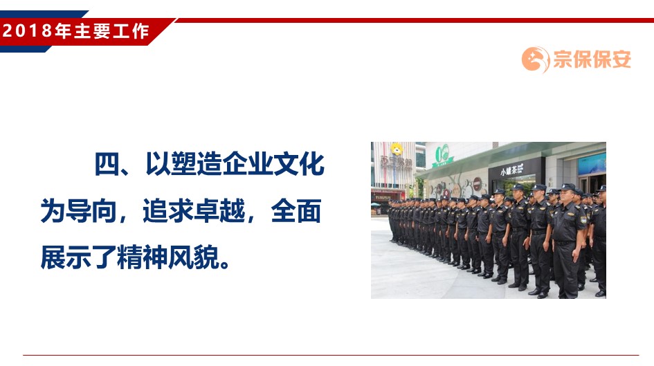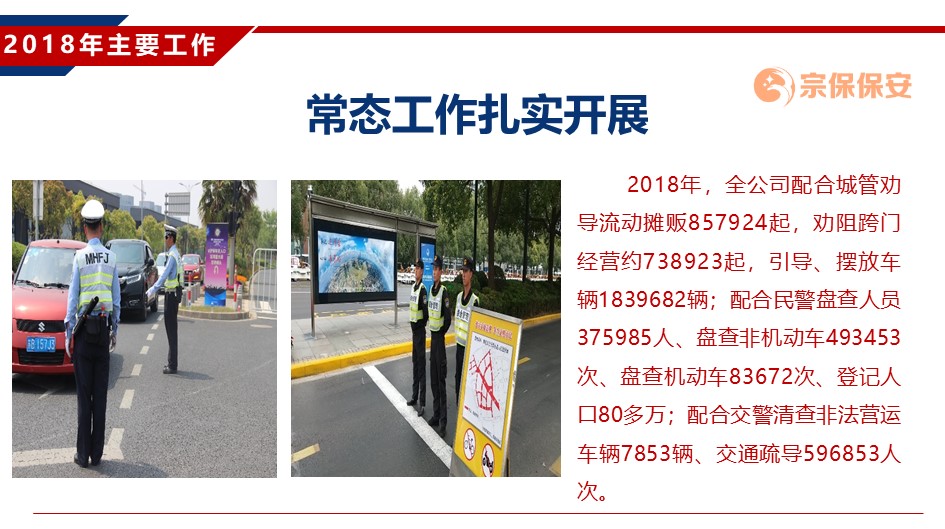 不忘初心,牢記使命。2018年,全公司配合城管勸導流動攤販857924起,勸阻跨門經(jīng)營約738923起,引導、擺放車輛1839682輛;配合民警盤查人員375985人、盤查非機動車493453次、盤查機動車83672次、登記人口80多萬;配合交警清查非法營運車輛7853輛、交通疏導596853人次。天量數(shù)據(jù)的背后,是宗保人對自己承諾的嚴格落實,對甲方單位的認真負責,對業(yè)務(wù)工作的一絲不茍。