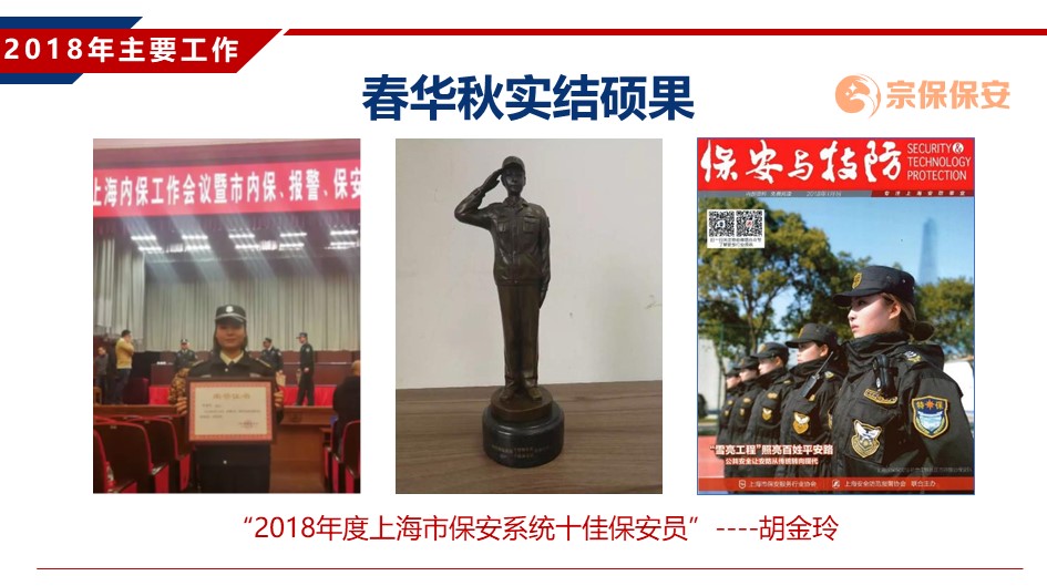 春風浩蕩滿目新,不負韶光萬里程。胡金玲被評為“2018年度上海市保安系統(tǒng)十佳保安員”,宗保保安駐大團鎮(zhèn)城管輔助中隊被評為“2018年度上海市保安系統(tǒng)先進保安隊”,王少軍、王付振等被評為“2018年度浦東新區(qū)見義勇為先進群體”。
