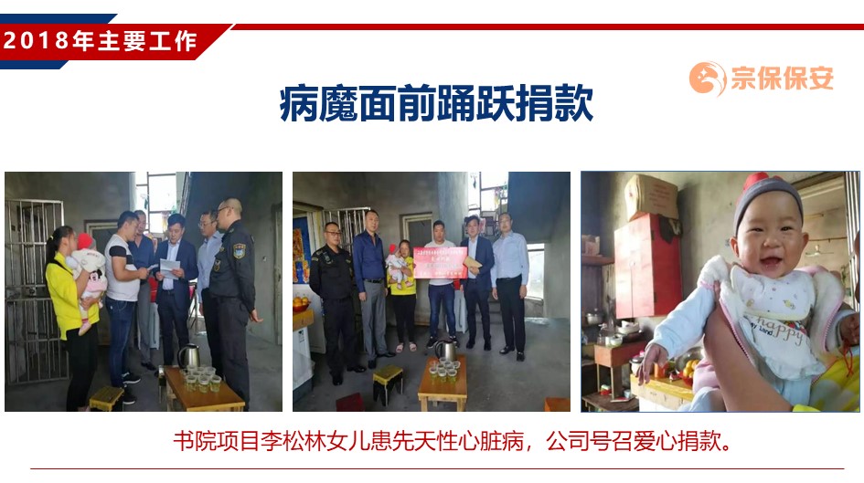 病魔無情,小孩重病陷困境;宗保有愛,踴躍捐款暖人心。2018年2月書院項目隊員李松林的女兒查出患先天性心臟病。高額的手術(shù)費使這個本就不富裕的家庭雪上加霜。病魔無情人有情。公司發(fā)出“愛心捐款、情暖員工”號召,隊員們紛紛伸出援助之手,慷慨解囊,獻出自己的一份愛心。一時間,公司形成了一片“愛的海洋”。一筆筆捐款匯聚著一股股暖流,短短幾日,便募集愛心捐款70460元。捐款活動充分體現(xiàn)了公司廣大員工團結(jié)友愛、互幫互助的美德;彰顯了公司奉獻、友愛、互助、進步的時代新風。