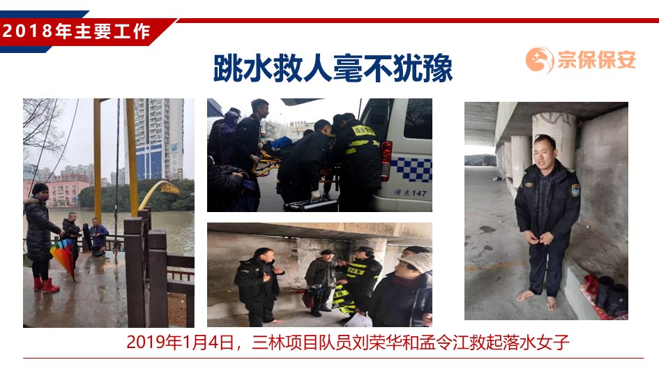 疾風知勁草,危急見忠誠。2019年1月4日,三林項目隊員劉榮華和孟令江巡邏執(zhí)勤時,發(fā)現(xiàn)有一名女子落水,情況十分危險。劉榮華迅速跳入水中施救;孟令江用繩索配合救援,兩人合力將女子救起。劉榮華和孟令江只是無數(shù)宗保好人的具體代表。2018年,全公司共交還遺失財物20多萬元,拒收賄賂10多萬元,找回走失兒童9人,300多人次打不還手、罵不還口,堅持文明值勤?!吧蠉徧峁┓?wù),微笑增添力量,刁難接受考驗,忍辱造就和諧”的服務(wù)理念已經(jīng)深深烙在每一名宗保人的心中。