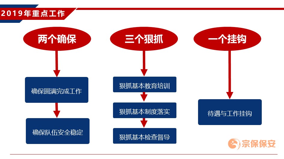 兩個確保:就是確保圓滿完成甲方交給的各項工作,確保隊伍安全穩(wěn)定。前者是使命所系、職責所在,沒有這個確保,公司和隊員就沒有存在的價值和作用;后者是根本保證和依托,沒有這個確保,一切工作都是空話,只能是水中月、鏡中花。