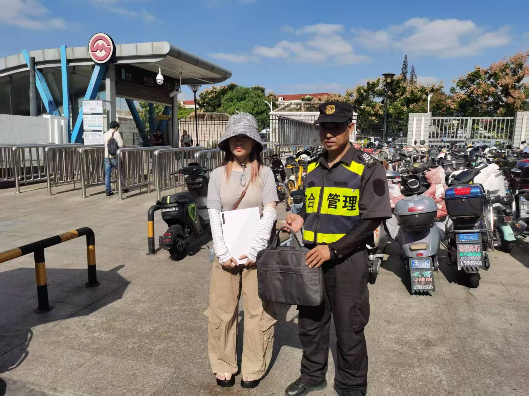 10月9日7:30,宗保公司駐浦東新區(qū)三林市容項目員工張展展在地鐵8號線楊思站1號口附近整理共享單車時,在一輛共享單車車筐里發(fā)現(xiàn)一個手提包,內(nèi)有一部蘋果牌筆記本電腦??紤]到失主可能會返回尋找,張展展便在原地邊執(zhí)勤邊等待失主。