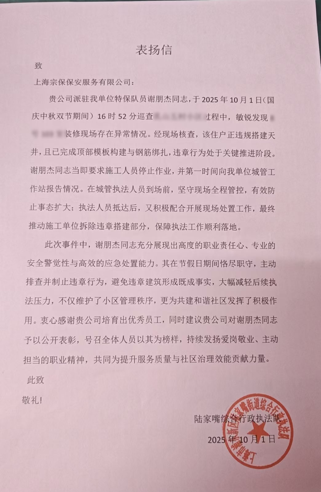10月1日,宗保公司收到浦東新區(qū)陸家嘴綜合行政執(zhí)法隊(duì)的表?yè)P(yáng)信,信中贊揚(yáng)了公司員工謝朋杰在節(jié)假日期間堅(jiān)守崗位、盡責(zé)善為,主動(dòng)排查并成功制止一起潛在的違章建筑行為,有效避免了違章事實(shí)的形成,維護(hù)了小區(qū)管理秩序,為共建和諧社區(qū)作出了積極貢獻(xiàn)。 (供稿人:孫富超)