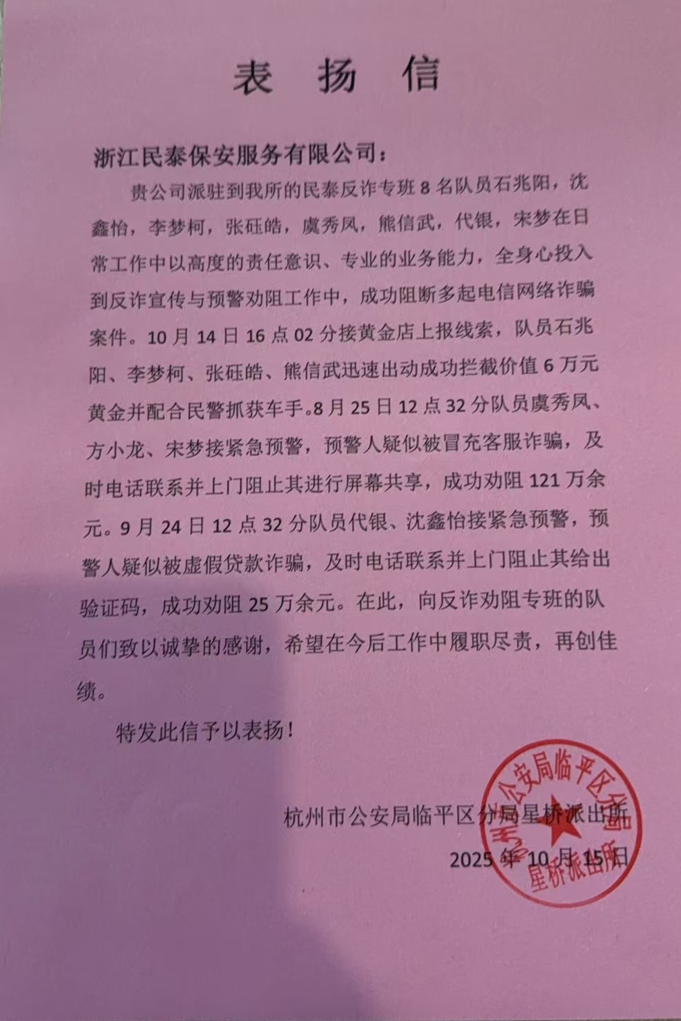 03浙江民泰公司8名反詐專班員工因成功阻斷多起電信詐騙受到表?yè)P(yáng)