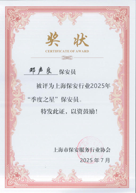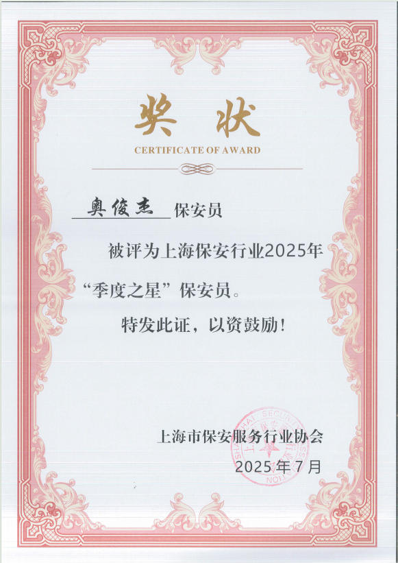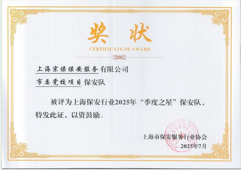 近日,上海市保安服務行業(yè)協(xié)會公布了上海保安行業(yè)2025年第二季度優(yōu)秀保安隊、保安員展示名單,宗保公司1個項目保安隊和3名員工個人獲此殊榮。