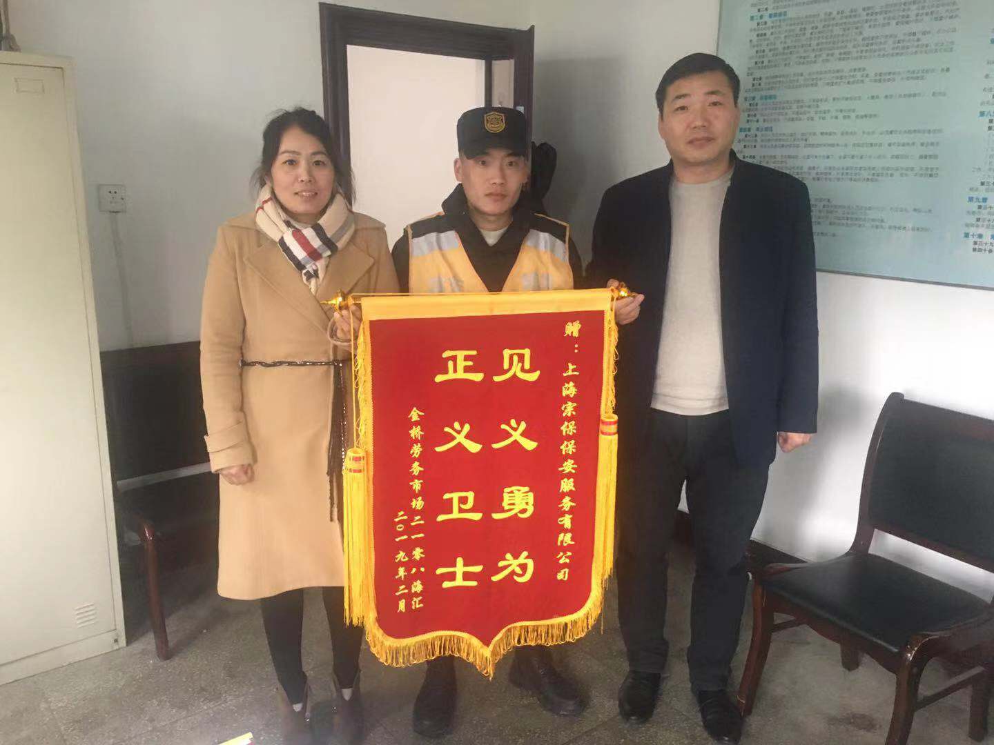 2019年2月22日,金橋勞務(wù)市場(chǎng)海匯勞務(wù)公司將一面錦旗送到宗保駐金橋市容項(xiàng)目負(fù)責(zé)人谷經(jīng)理手上,感謝宗保隊(duì)員見義勇為,解救其公司女員工的行為,避免了一次惡性事件發(fā)生。