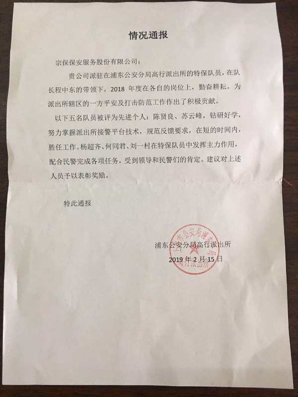 高行派出所副所長(zhǎng)朱偉青和警長(zhǎng)姚志祥出席了會(huì)議,對(duì)2018年工作進(jìn)行了總結(jié),并做出了2019年工作計(jì)劃部署。會(huì)上對(duì)2018年度先進(jìn)保安個(gè)人進(jìn)行表彰并獎(jiǎng)勵(lì)。宗保公司駐高行項(xiàng)目隊(duì)員:陳賢良、蘇云峰、楊超齊、何同君、劉一村由于平時(shí)工作表現(xiàn)出色,受到了表彰及獎(jiǎng)勵(lì)。