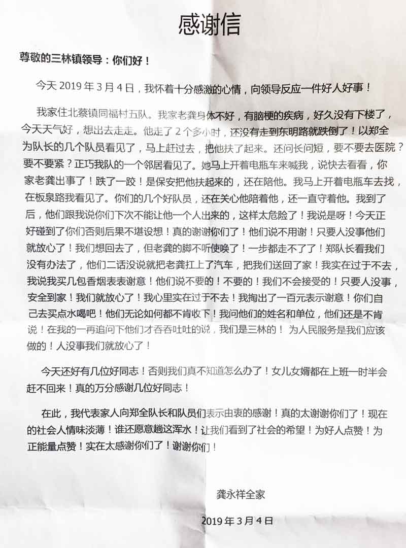 2019年3月5日早上10:00,三林城管市容中心收到一封感謝信,信件內(nèi)容是感謝宗保駐三林市容項(xiàng)目隊(duì)員熱心幫助倒地老人。