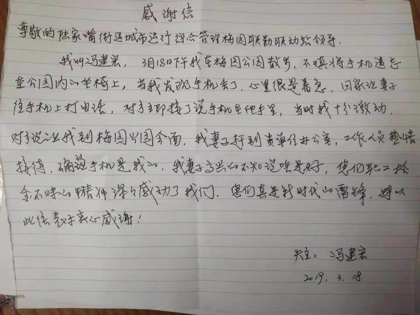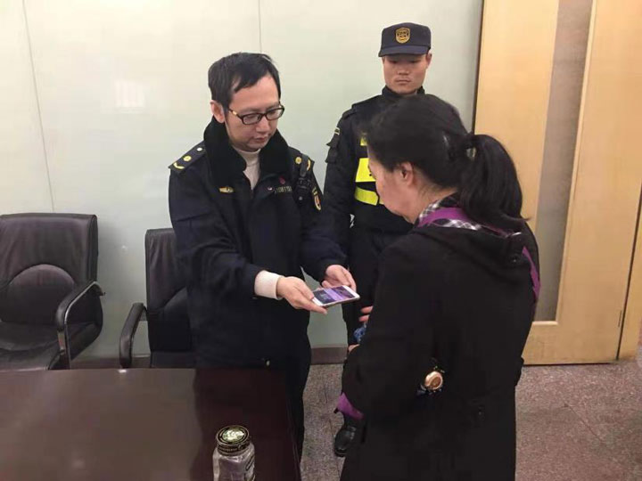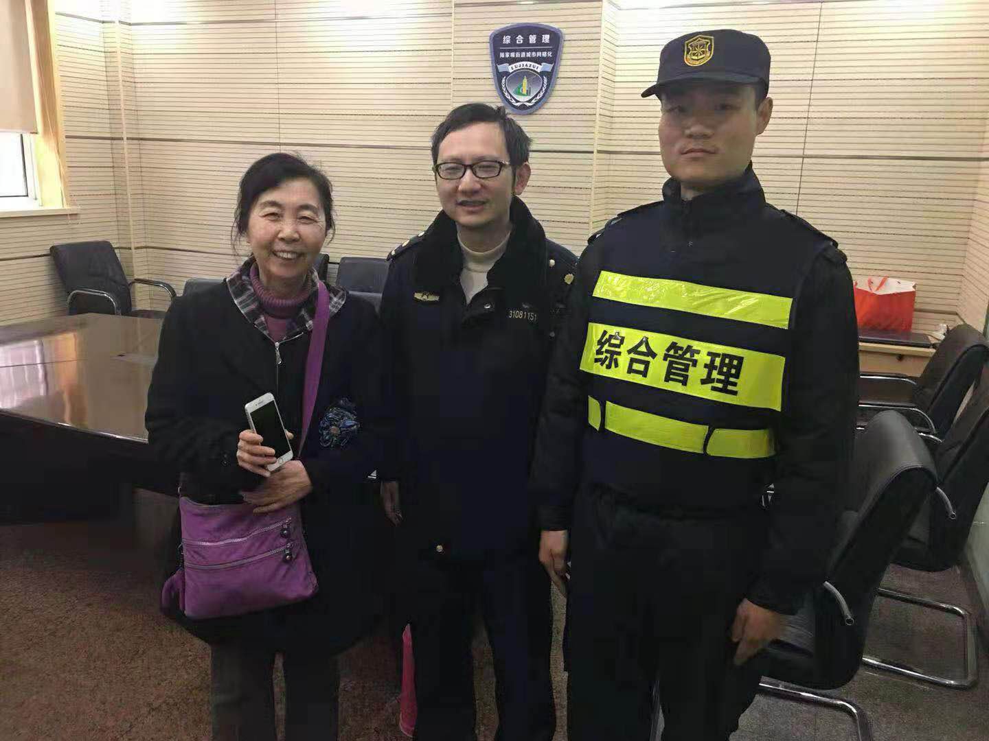 下午15:00時,失主老奶奶至城管中隊,經(jīng)核對無誤,城管隊員將手機交還給失主,老奶奶再三表示感謝,并要支付酬金給撿到手機的特保隊員。隊員當(dāng)即表示不用酬謝。
