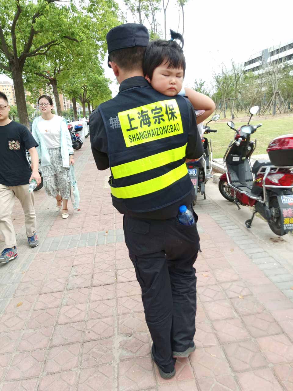 宗保公司帶隊(duì)領(lǐng)導(dǎo)接到情況報(bào)告后,立即通知發(fā)動(dòng)了所有參與公園現(xiàn)場(chǎng)保障的保安隊(duì)員尋找孩子。隊(duì)員們根據(jù)該女士提供的和女兒走散的大致方位,不顧炎熱在密集的人流中來(lái)回穿梭,最終找到走散的孩子。