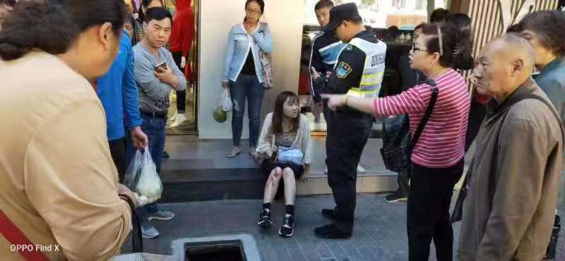 10月22日08:20分左右,宗保公司駐金楊街道城管輔助隊(duì)員郗金祥和王偉偉巡查至金楊路654號(hào)門口時(shí),發(fā)現(xiàn)一名受傷女子。經(jīng)詢問得知,該女子走路踩到一處井蓋,井蓋塌陷,導(dǎo)致腿部摔傷。