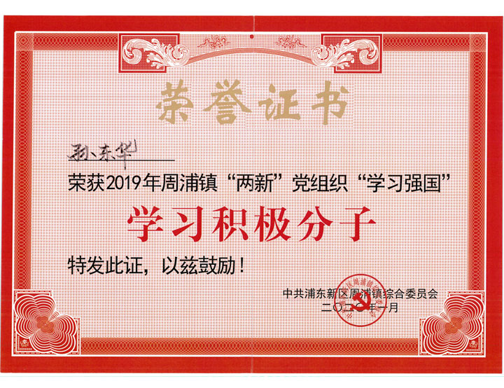 2020年1月3日,浙江民泰公司副總經(jīng)理孫東華被浦東新區(qū)周浦鎮(zhèn)評為2019年“兩新”黨組織“學(xué)習(xí)強(qiáng)國”學(xué)習(xí)積極分子,受到表彰。