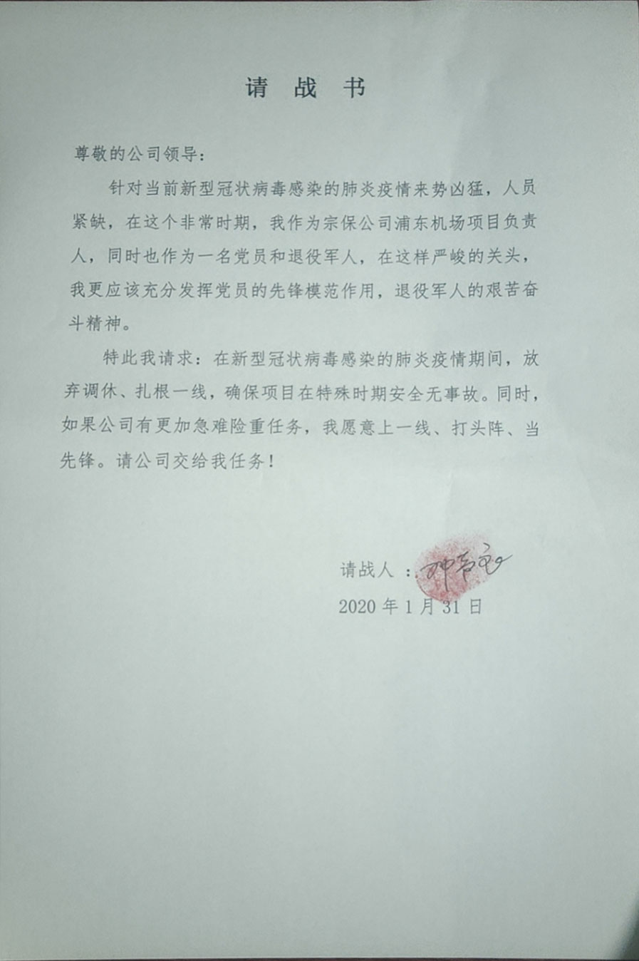 鄧聲良說:“作為宗保公司浦東機(jī)場項(xiàng)目負(fù)責(zé)人,同時(shí)也作為一名黨員和退役軍人,在這樣嚴(yán)峻的關(guān)頭,我更應(yīng)該沖鋒在前、主動(dòng)作為,充分發(fā)揮先鋒模范作用。”