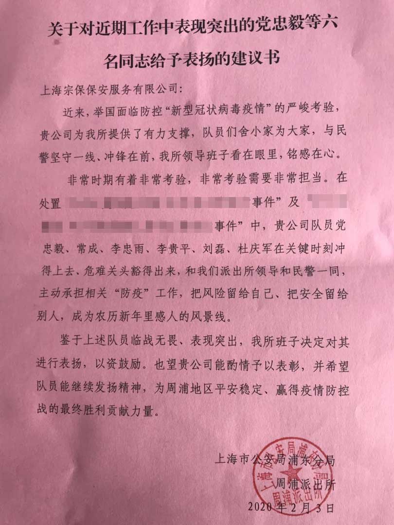 特殊時(shí)期勇?lián)?dāng) 無畏履職受表彰 ——周浦派出所表揚(yáng)獎(jiǎng)勵(lì)公司6名輔警隊(duì)員