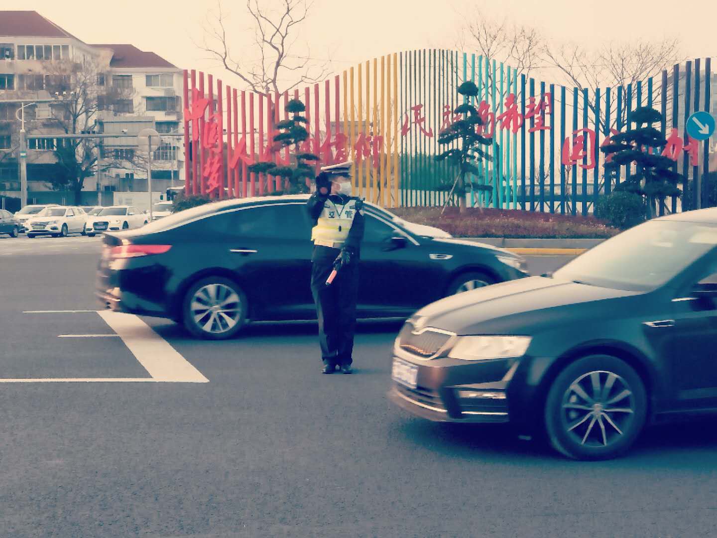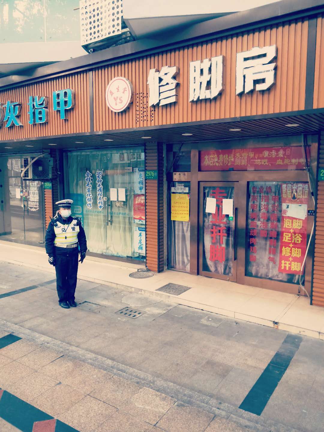 在疫情防控中,康建鋒除了完成日常工作外,配合民警維持市民藥店門口購買防護(hù)用品排隊(duì)秩序。