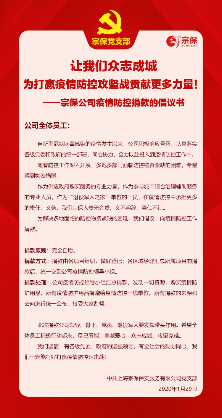 2月4日,宗保公司黨支部發(fā)出的一封《讓我們眾志成城,為打贏疫情防控阻擊戰(zhàn)貢獻(xiàn)更多力量》號(hào)召員工向疫情防控工作一線單位捐款的倡議書,在公司內(nèi)部引起了熱烈反響。