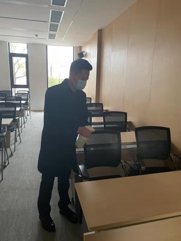 疫情防控中,胡康威配合甲方檢測(cè)進(jìn)入小區(qū)人員體溫,排查疫區(qū)來(lái)滬人員,每天對(duì)公共區(qū)域進(jìn)行消毒。