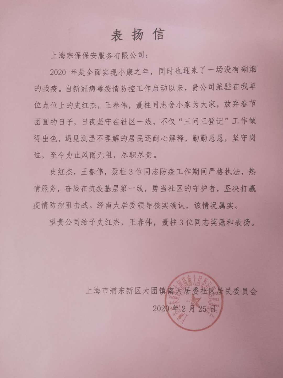 2月25日,宗保公司收到浦東新區(qū)大團(tuán)鎮(zhèn)南大居委社區(qū)的表?yè)P(yáng)信,表?yè)P(yáng)公司駐大團(tuán)項(xiàng)目的史紅杰、王春偉、聶柱三名隊(duì)員在疫情防控中的工作表現(xiàn)。