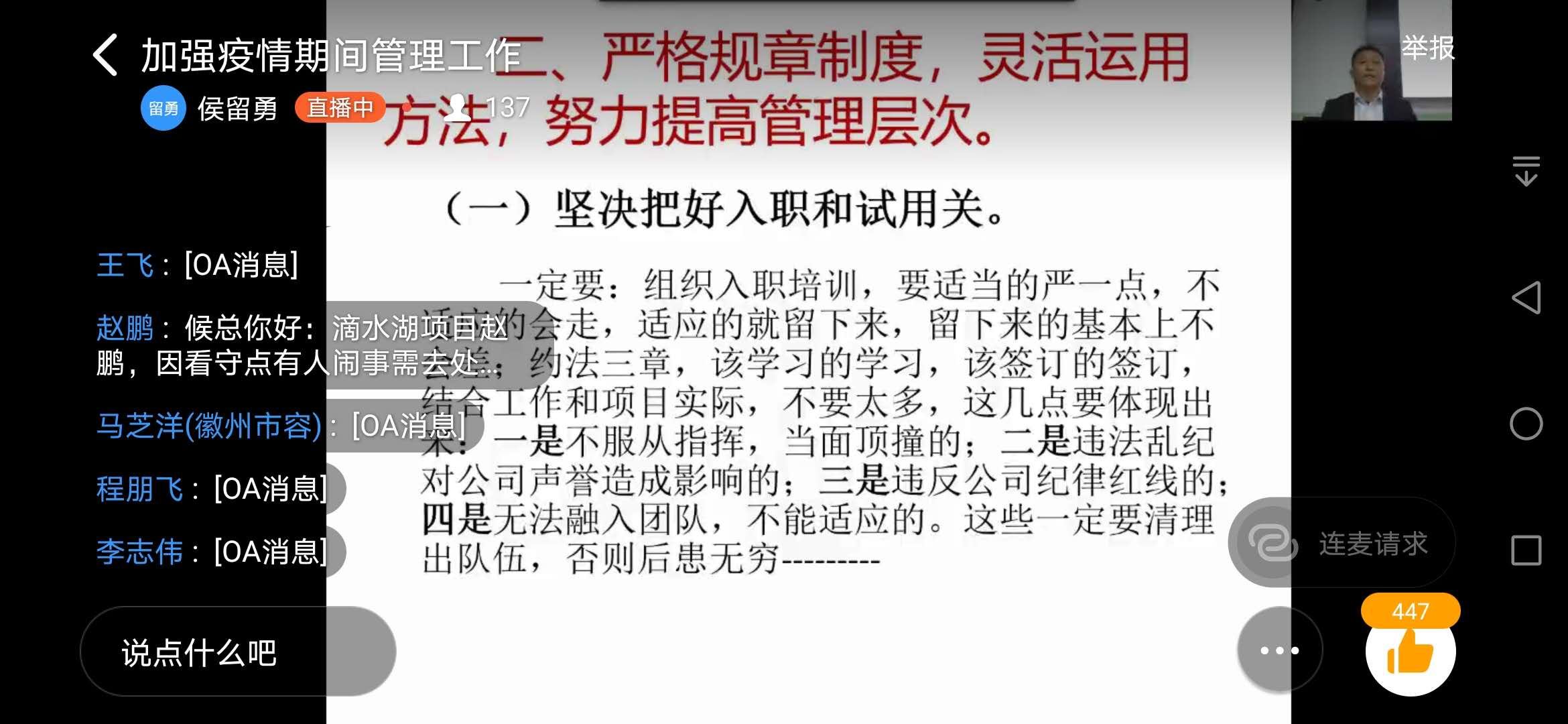 4月3日18點(diǎn),宗保公司副總經(jīng)理侯留勇通過釘釘軟件就《如何抓好疫情期間的管理工作》進(jìn)行線上授課,上海區(qū)域、杭州區(qū)域、黃山區(qū)域的150多名骨干同步聽課。
