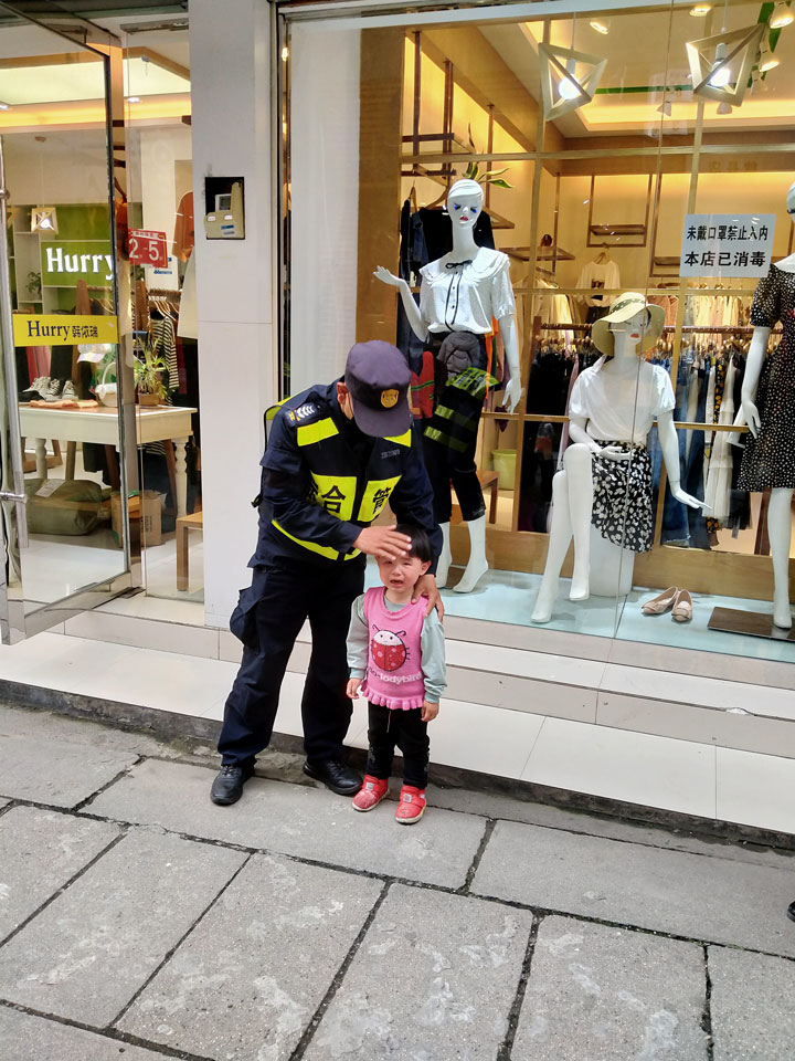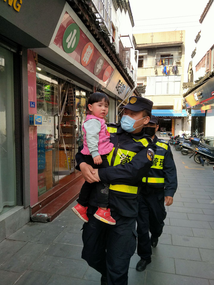4月22日,宗保公司駐黃山歙縣市容項(xiàng)目隊(duì)員程帥強(qiáng)、米楊楊巡邏至古城步行街一家女裝店門口時(shí),一個(gè)小女孩的哭聲引起了二人的注意,小女孩看上去大概三歲多的樣子,哭著說(shuō)要找奶奶。
