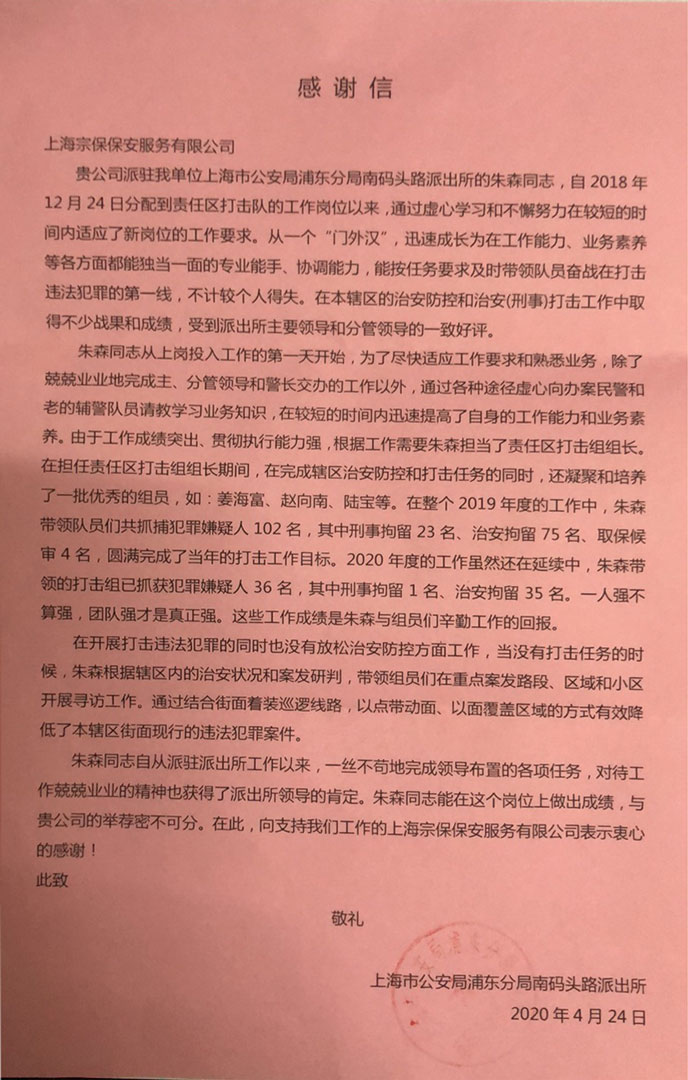 截至4月30日,宗保公司參與疫情防控共出動人員43.3萬多人次,在19座寺廟(庵)勸離香客,49處路口設(shè)卡,6個地鐵站口檢測進出地鐵站人員體溫,3個高鐵站檢測出站旅客體溫,浦東、虹橋2個機場4個候機樓秩序維護,146個小區(qū)門口檢測進入小區(qū)人員體溫,76個集中隔離點值班守護,930多人次接送隔離人員,214戶居家隔離保障,121個藥店秩序維持,配合查處活禽交易236起,盤查人員83.8萬多人次、盤查車輛21.8萬多車次。