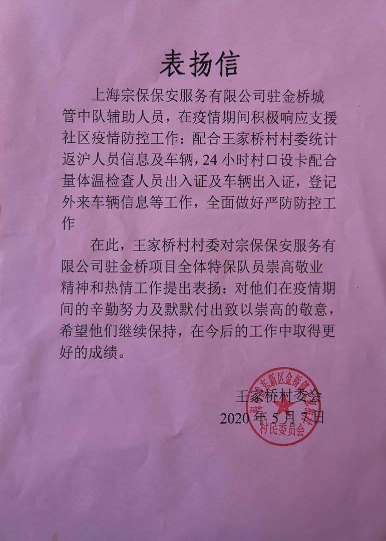 新冠肺炎疫情防控中,上海宗保保安服務(wù)有限公司駐金橋市容項(xiàng)目隊(duì)員不辭辛苦、甘愿奉獻(xiàn),配合王家橋村委會(huì)落實(shí)好各項(xiàng)疫情防控措施,為王家橋村的疫情防控工作做出了應(yīng)有貢獻(xiàn),收到了王家橋村委會(huì)送來(lái)的錦旗和感謝信。