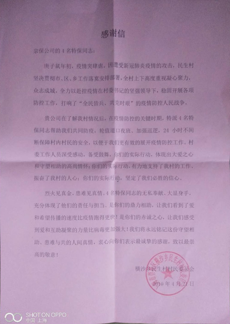 4月21日,宗保公司駐崇明橫沙市容項(xiàng)目收到民生村村委會(huì)送來(lái)的感謝信,信中對(duì)宗保公司參與民生村疫情防控的隊(duì)員們表示感謝。