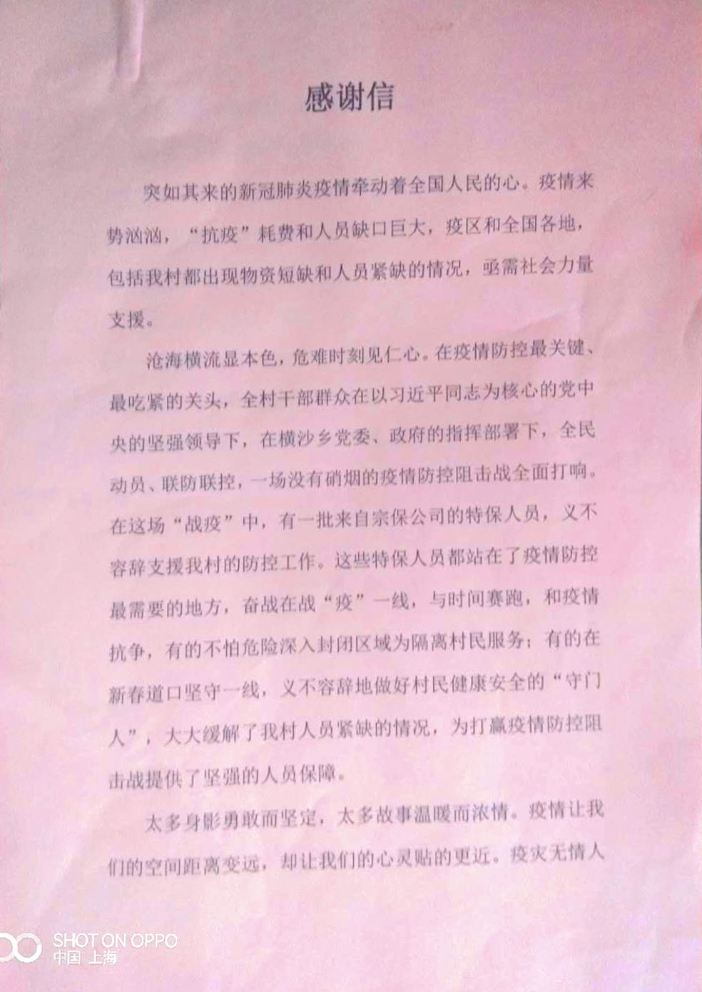 4月20日,宗保公司駐崇明橫沙市容項(xiàng)目收到橫沙鄉(xiāng)新春村村委會(huì)送來(lái)的感謝信,信中對(duì)在疫情期間支援新春村疫情防控工作的隊(duì)員們表示感謝。
