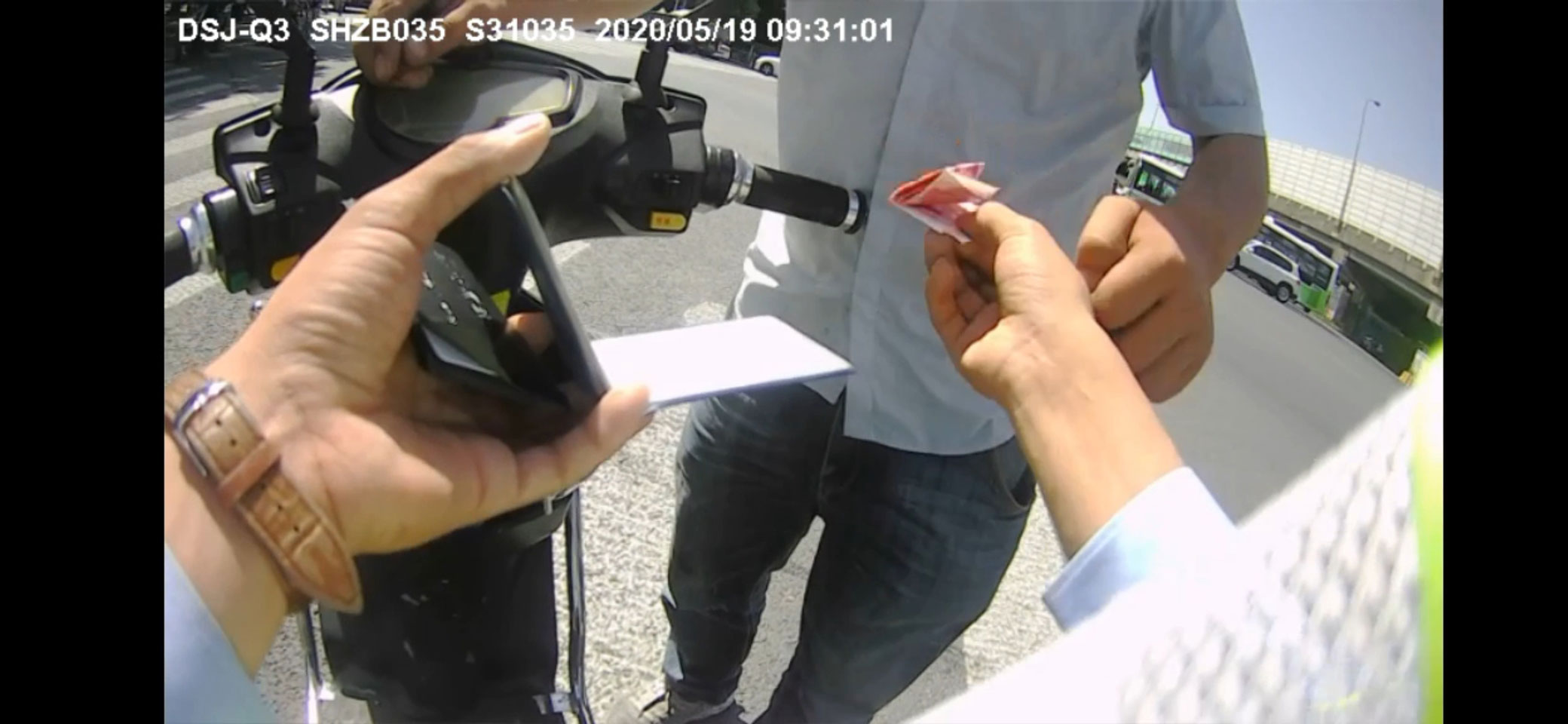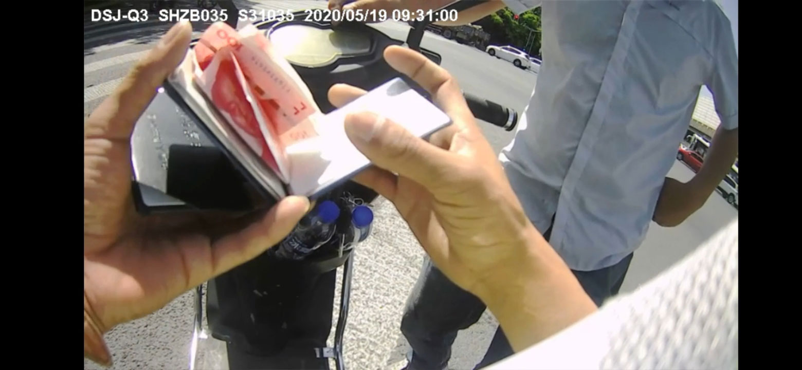 5月19日9:30,宗保公司駐閔行區(qū)域虹橋交通輔警項目副組長付光東,在顧戴路S20下口處配合民警進行交通整治過程中,一名違章的機動車駕駛員在行駛證中夾帶了200元現(xiàn)金,希望付光東“高抬貴手”對其違法行為網(wǎng)開一面。付光東對該駕駛員的賄賂嚴詞拒絕,并將該駕駛員的行為上報現(xiàn)場民警。