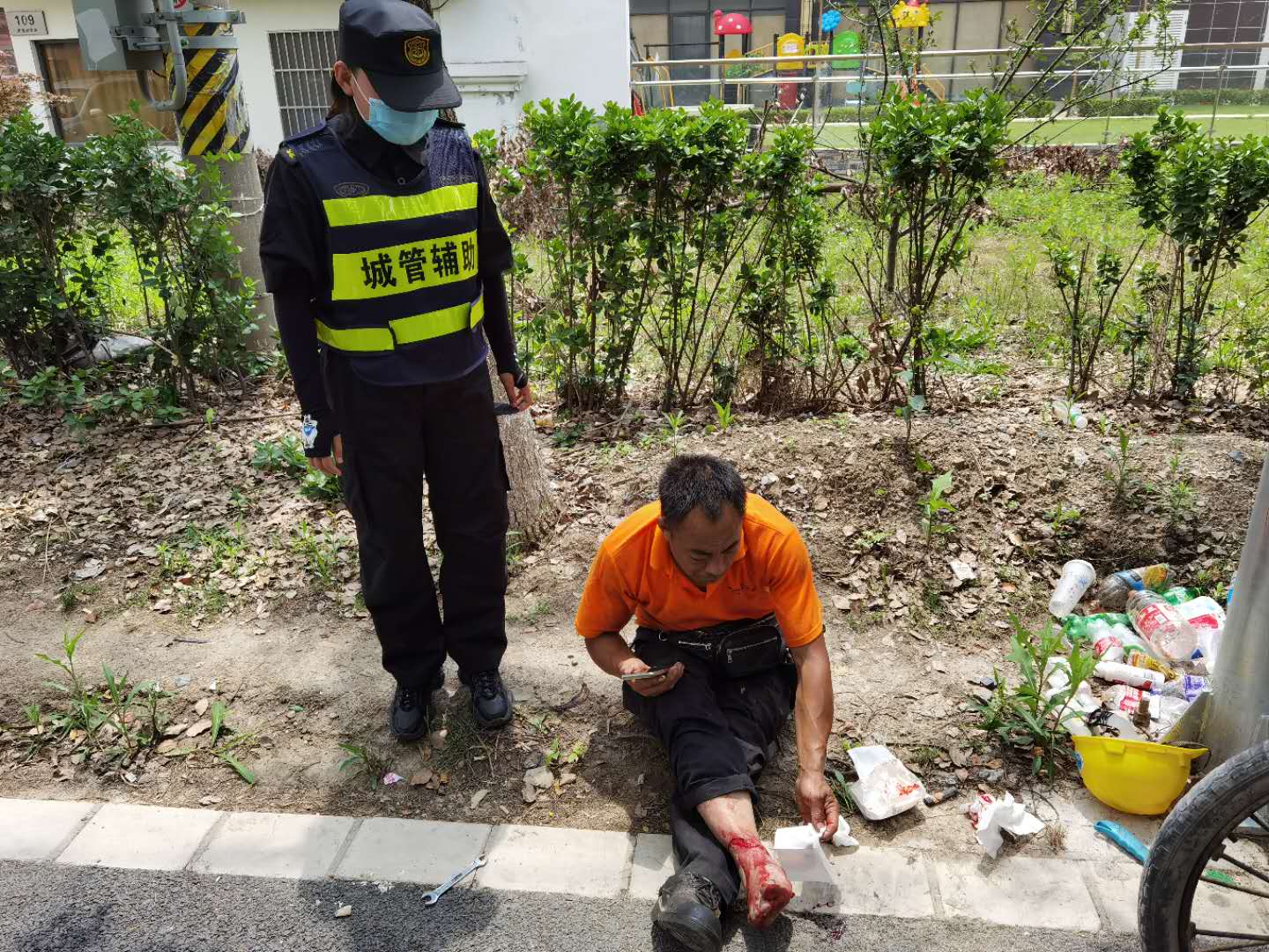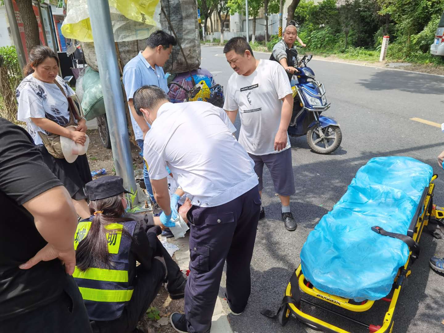 宗保公司駐周浦市容五組隊員吳吉喆剛好巡邏至此,急忙上前查看,老人身體多處受傷,且傷勢嚴重流血不止。原來是因為三輪車搭載過重,老人力氣不足,無法控制車輛,才導致事故的發(fā)生。小吳把老人攙扶起身,撥打120急救電話,并緊急通知附近崗位執(zhí)勤隊員前來支援。